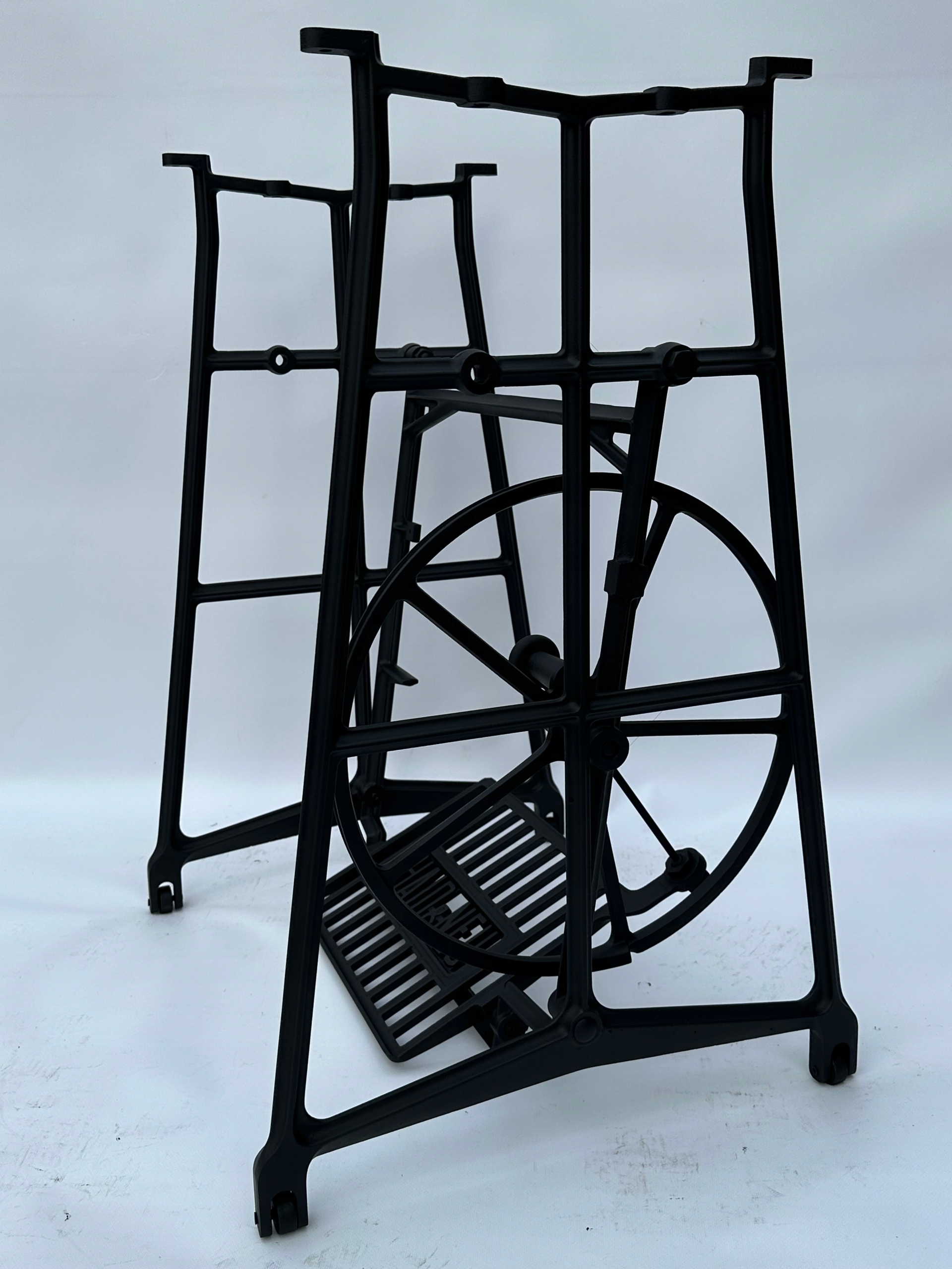 У верхній частині є 4 оригінальних отвори, до яких можна прикріпити стільницю. Це видно на останньому фото. Стан - після професійного ремонту. Піскоструменева і пофарбована в чорний колір, як на фото - готова до установки. Після додавання верху він може служити, наприклад, комп’ютерним столиком. Якщо ви шукаєте щось оригінальне, цей аукціон саме для вас.