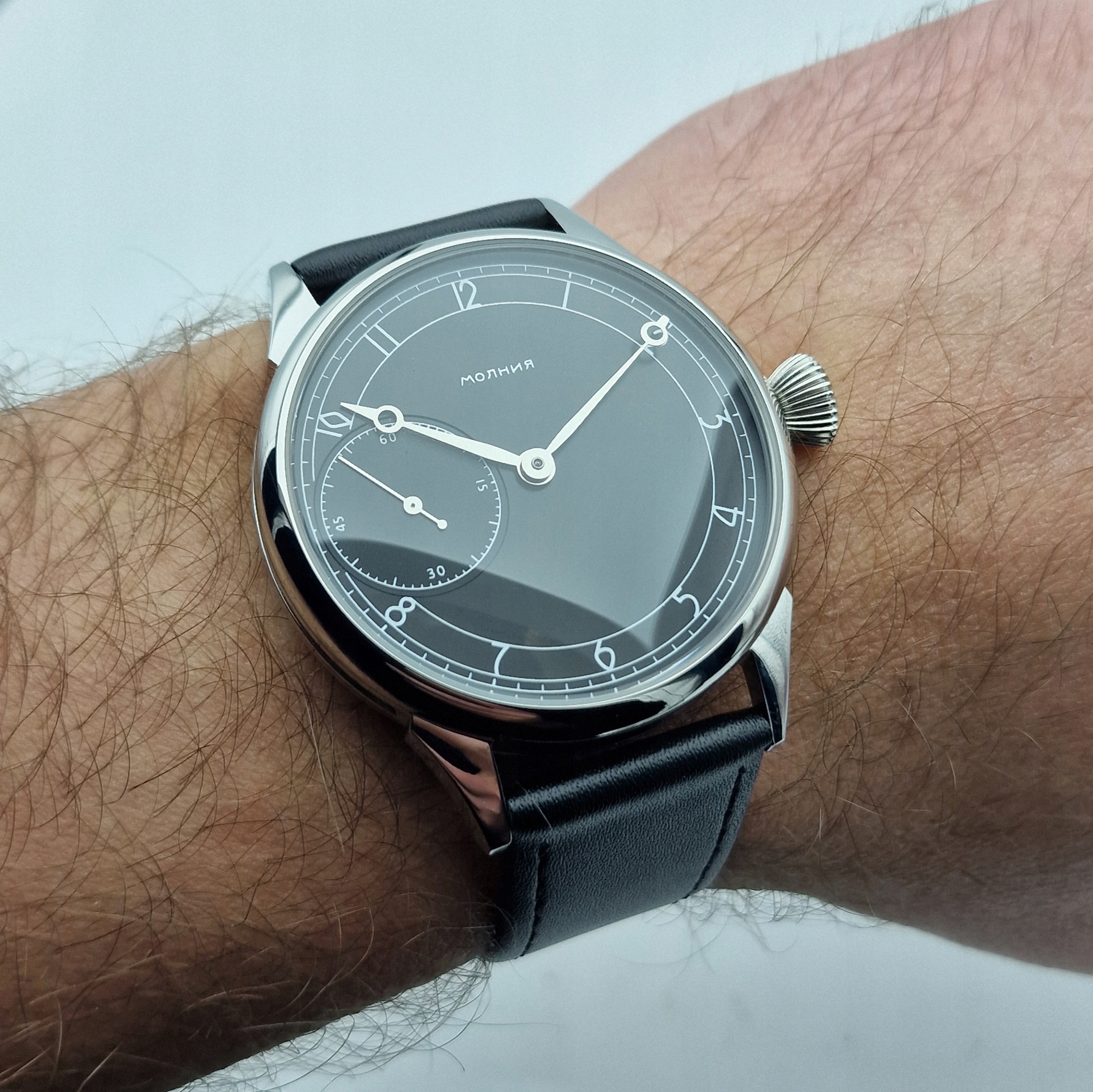 - Срібний циферблат із чорними арабськими цифрами та секундною стрілкою на дев’ятій годині. На щиті підпис: «MOLNIJA». Циферблат в ідеальному стані.