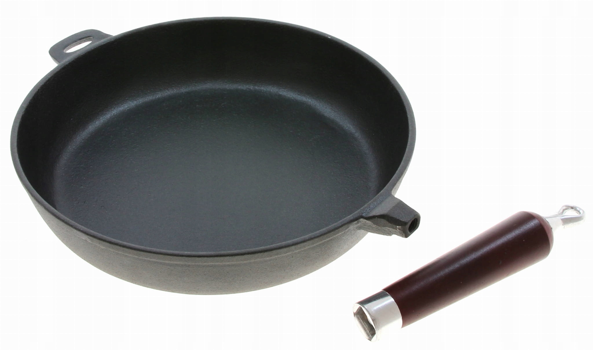 - Знімна дерев'яна ручка дозволяє використовувати сковороду в духовці та полегшує зберігання.