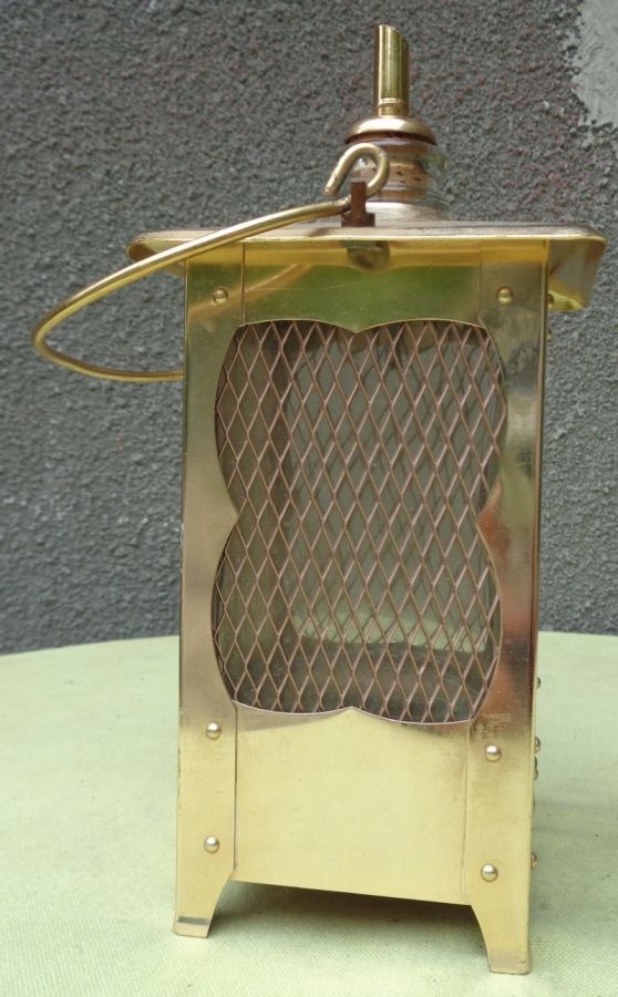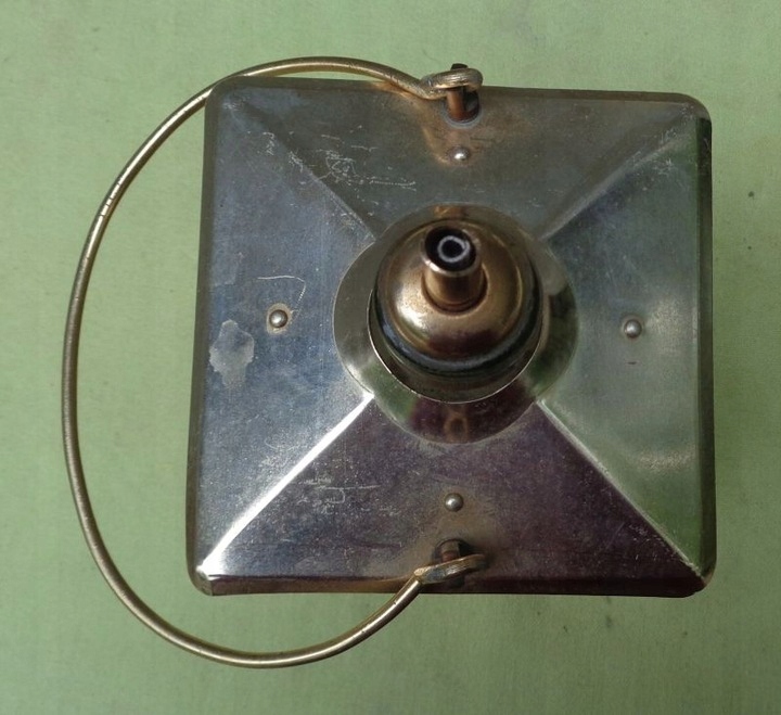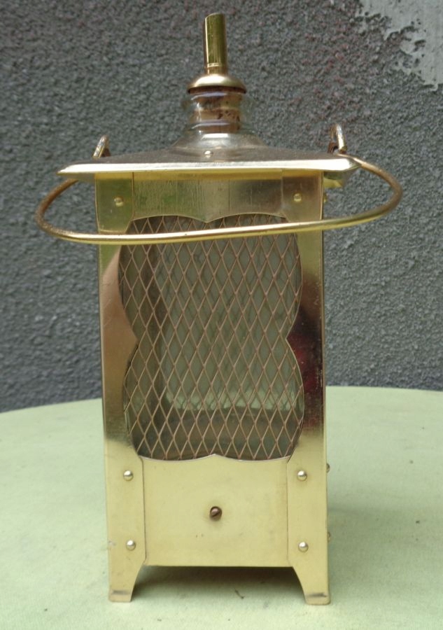 Цікавий, цікавий світильник з ручкою з латуні. Експонат походить з 1950-х років. стіни світильника були покриті латунним листом. Листовий метал кріпиться до цілого за допомогою латунних заклепок. У центральній частині розташовані скляні вставки, покриті латунною решіткою. У нижній частині експоната є дерев’яна основа. Верхня частина експоната виготовлена з латуні. У верхній частині знаходиться скляна вставка з латунною воронкою. Лампа має цікаву структуру та форму. Рекомендую всім.