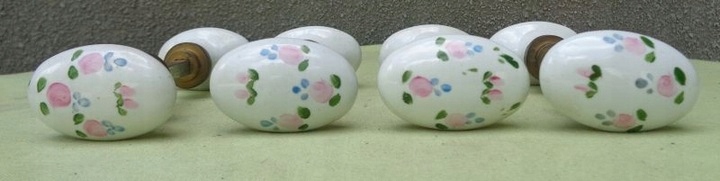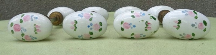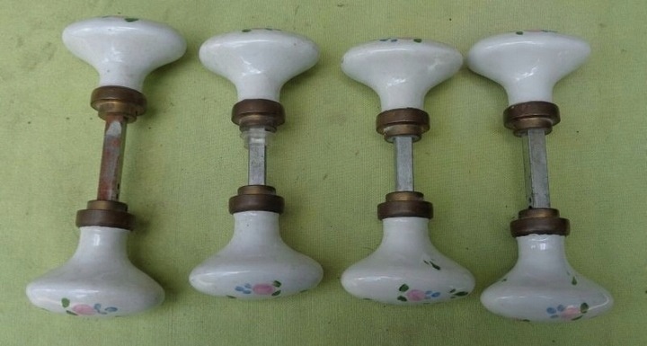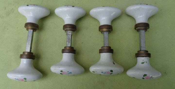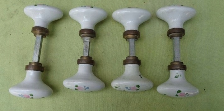 Цікаві, розписані вручну, чотири дверні ручки з порцеляновими ручками 1910-1930 років. Порцелянові ручки виготовлені на французькому фарфоровому заводі в Ліможі. Ручки мають цікаву, цікаву овальну форму. Вони були цікаво прикрашені власноруч розписаними різнокольоровими квітами. Дуже якісна порцеляна кольору слонової кістки. Дві ручки більші і дві менші. Порцеляна без пошкоджень. Рекомендую всім.