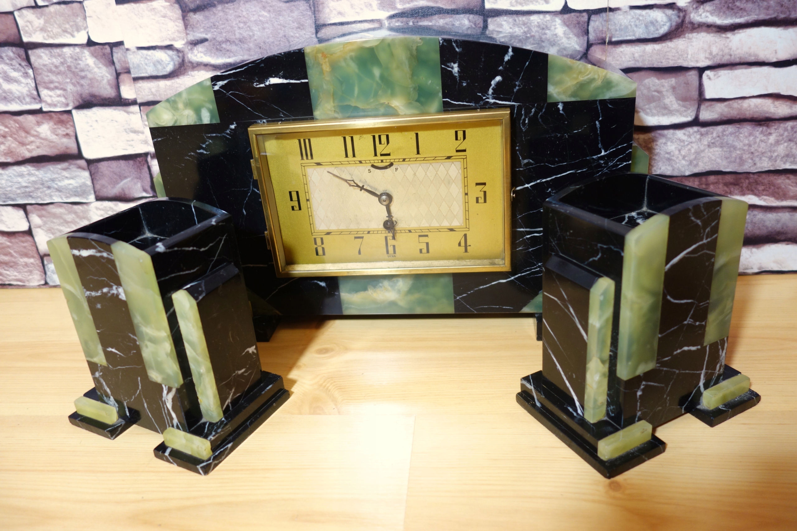 Годинник дуже декоративний, поєднання чорної мозаїки та зеленого мозаїчного мармуру дає дивовижний візуальний ефект.Набір доповнено двома насадками, що робить годинник дуже великим і вражаючим