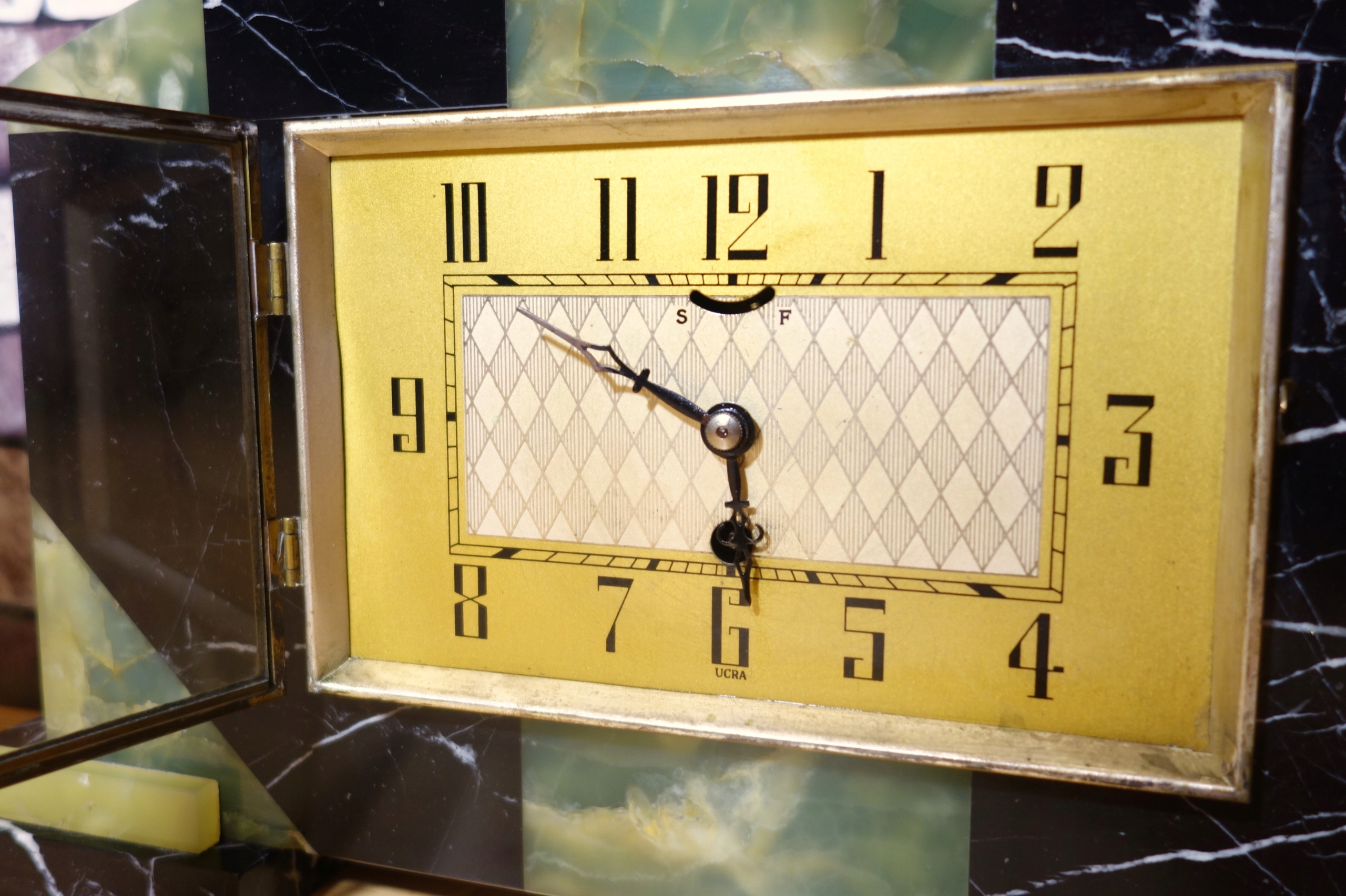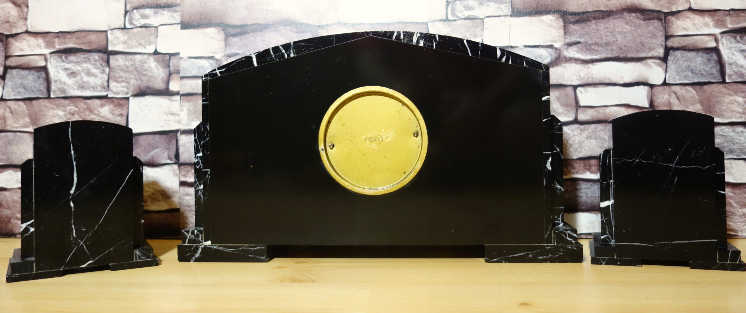 Ciekawy ,duży ,zegar kominkowy Art Deco marmur plus przystawki