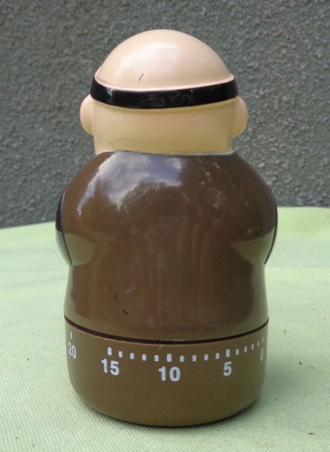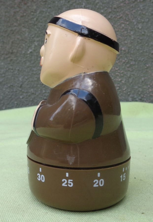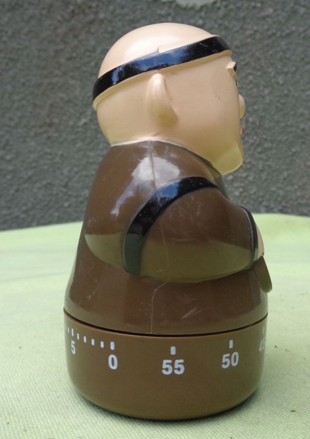 Цікавий, цікавий, колекційний, функціональний годинник. Експонат був виготовлений із пластику. Годинник означає ресторан Pere Joseph. Годинник у вигляді ченця. За допомогою рухомої нижньої частини з роздільником встановлюємо цікавий для нас проміжок часу. Максимальна тривалість – 55 хвилин. Коли встановлений час закінчується, лунає дзвінок. Монах тримає в руках логотип ресторану. Експонат був акуратно і акуратно виготовлений. Годинник функціональний. Рекомендую всім.