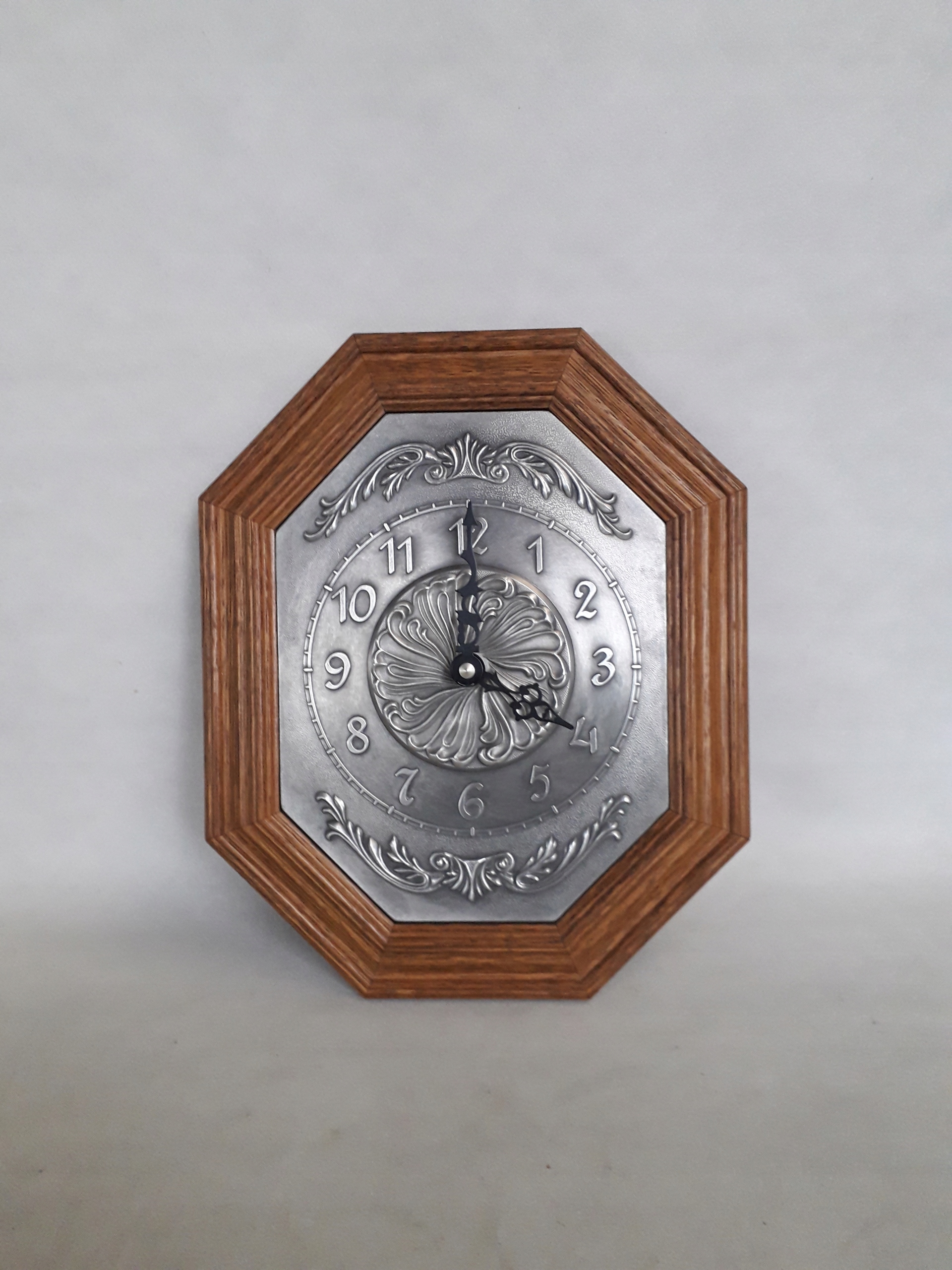 ŚCIENNY ZEGAR CYNOWY W DREWNIANEJ RAMIE CYNA