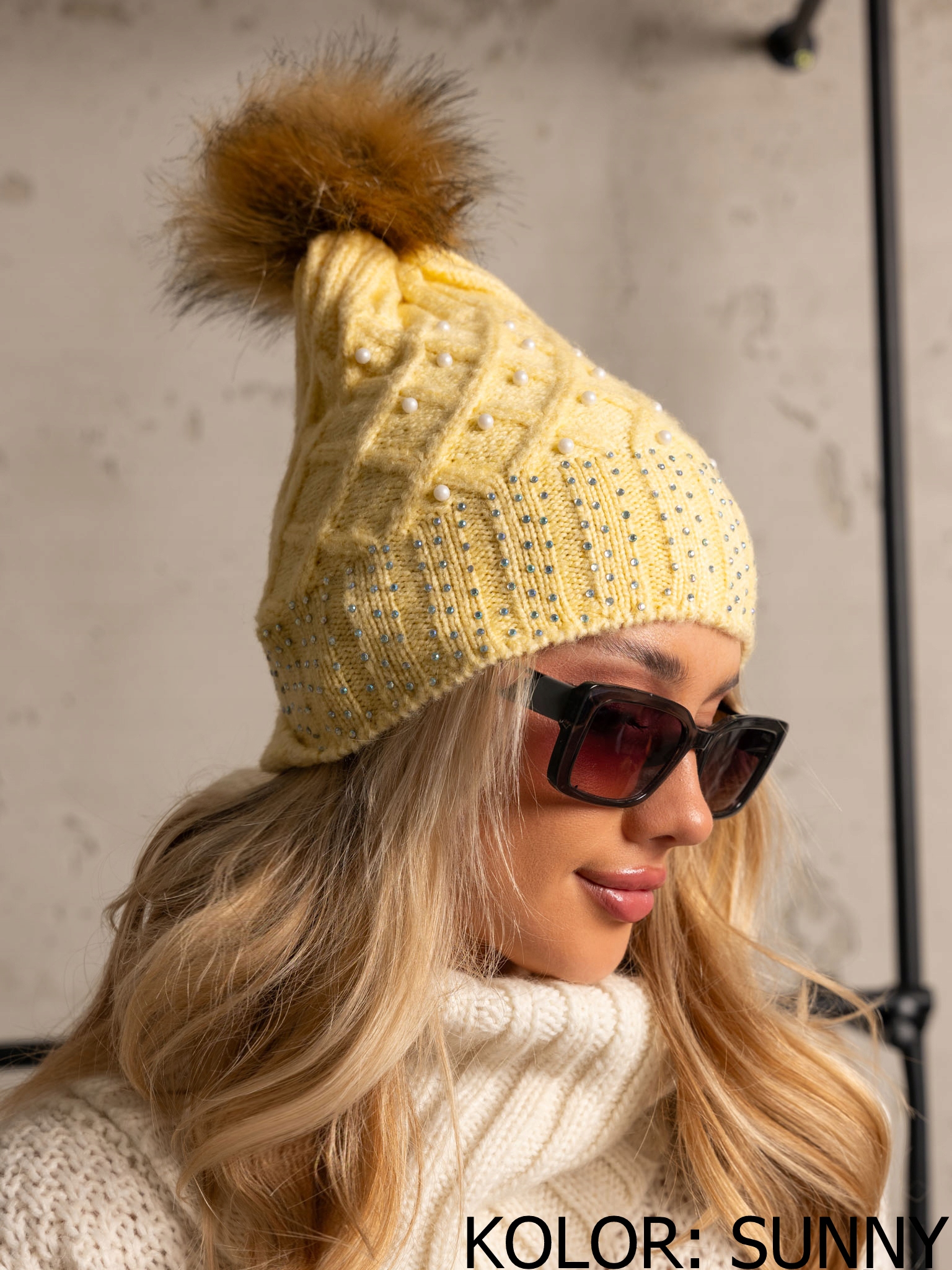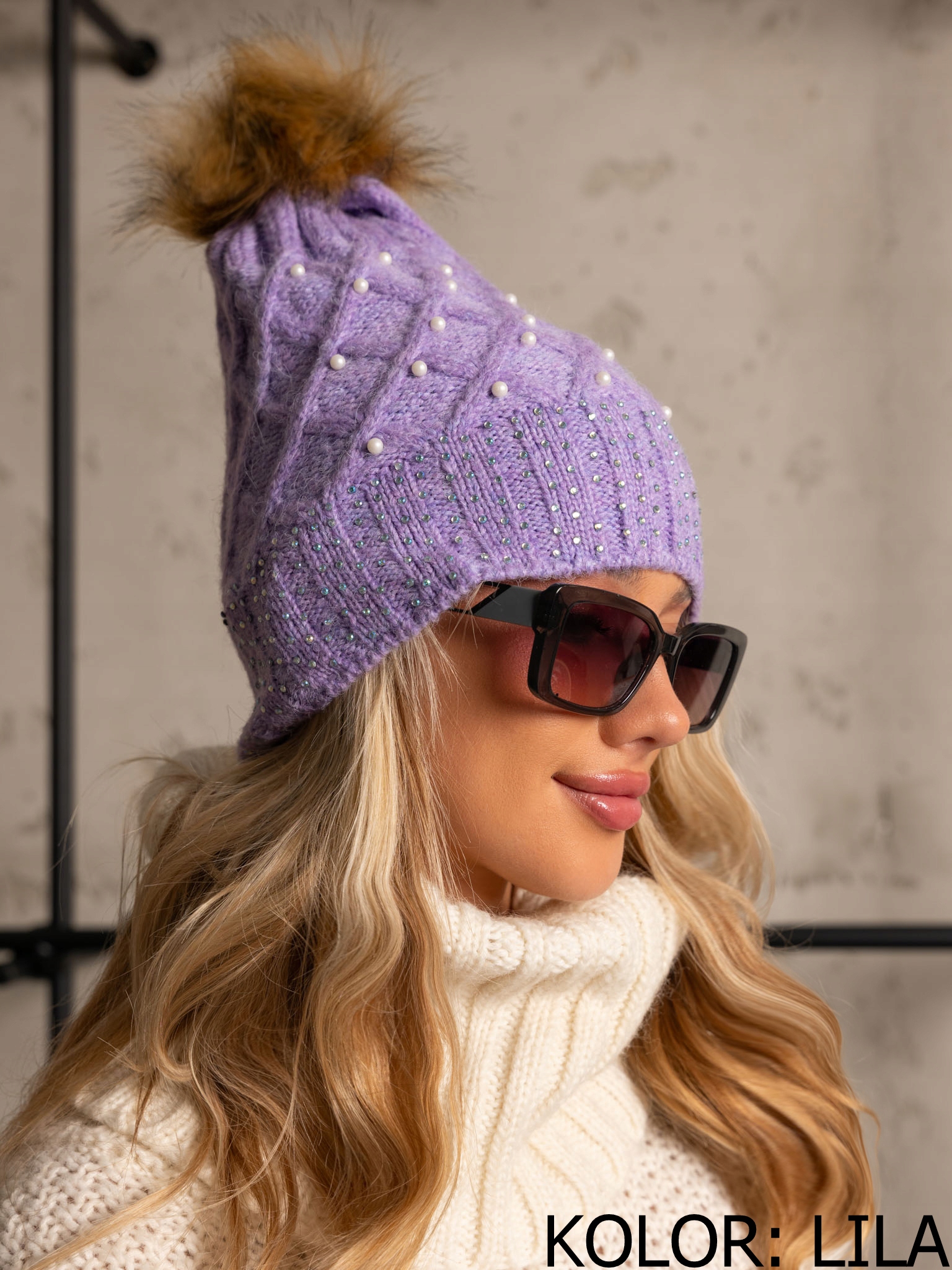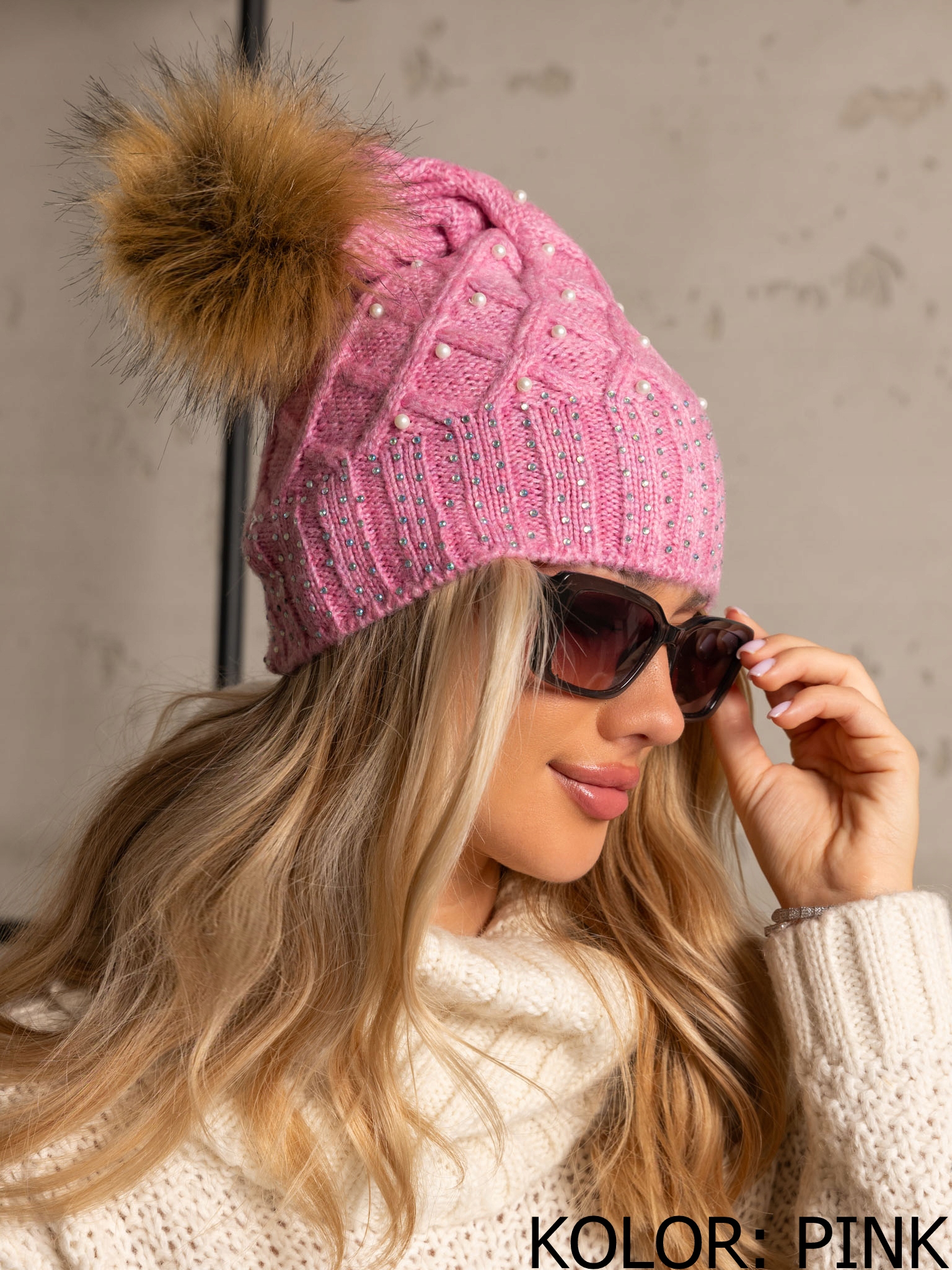 Ciepła Modna Zimowa CZAPKA Pompon Tłoczenia Cyrkonie Perełki Dużo Kolorów