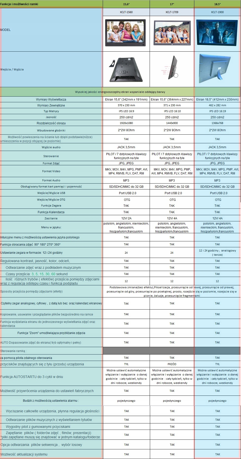 Матриця представленої цифрової рамки зі співвідношенням сторін 16:9 має оптимальну роздільну здатність 1366x768, співвідношення сторін зображення 16:9і яскравість 250 cdm2, Контраст лінійно регулюється, що фактично ідеально відображає кольори та насиченість кольорів, адаптовану до потреб (Це оптимальне поєднання цих 3 параметрів). Завдяки цим параметрам усі представлені фотографії будуть «радувати око» кожного глядача, це чудово підходить для представлення наших спогадів із сімейних зустрічей, подорожей, свят і важливих моментів із близькими людьми.
