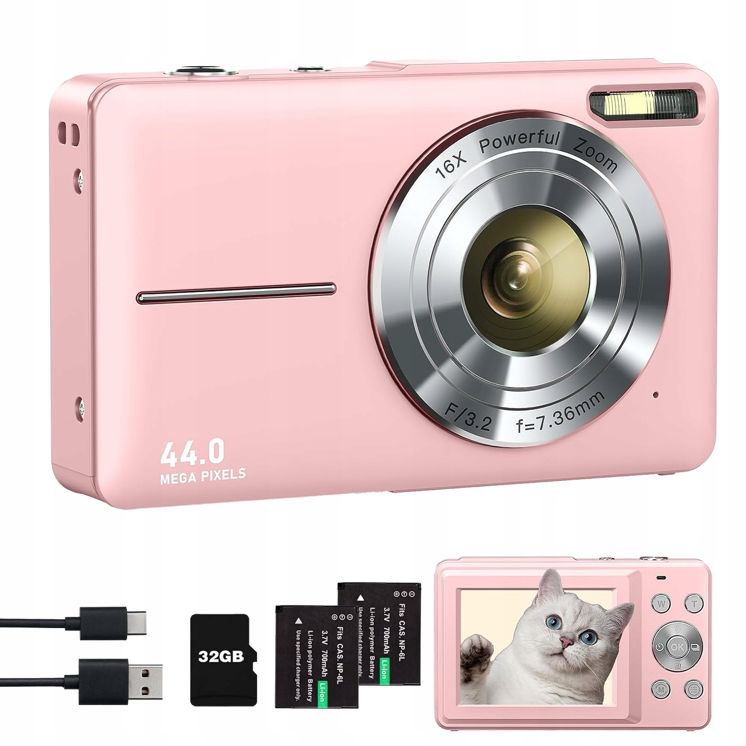 Цифрова камера, дитяча камера з картою пам’яті 32 ГБ, компактна відеокамера з роздільною здатністю FHD 1080P 44 Мп, камера з 16-кратним цифровим зумом, портативна міні-камера для дітей-підлітків (рожева)