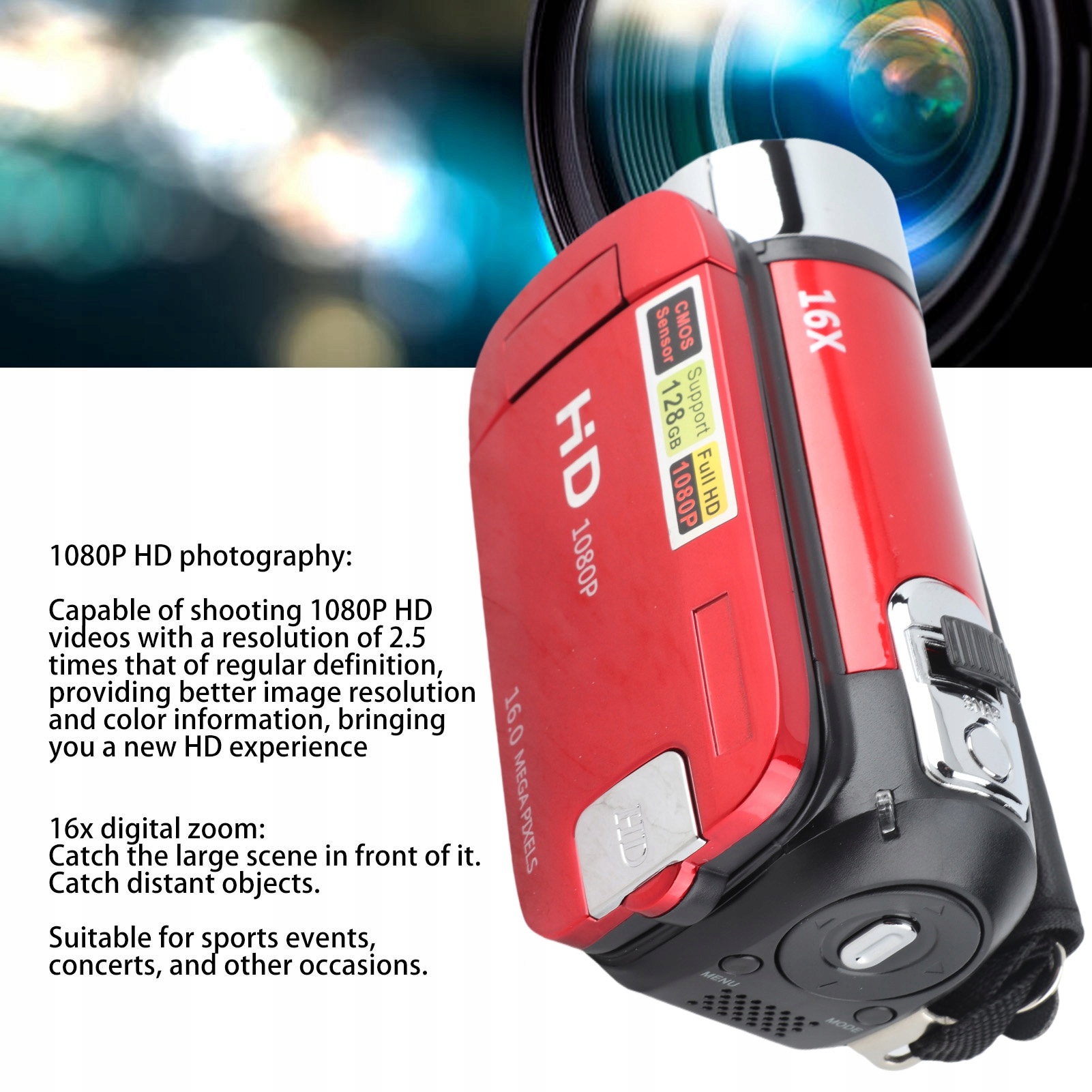 1. 1080p HD Фотографія: Ця камера може зловити фільми HD 1080p з роздільною здатністю в 2,5 рази більше, ніж регулярне визначення, забезпечуючи кращу роздільну здатність зображення та кольорову інформацію, надаючи абсолютно новий досвід HD.