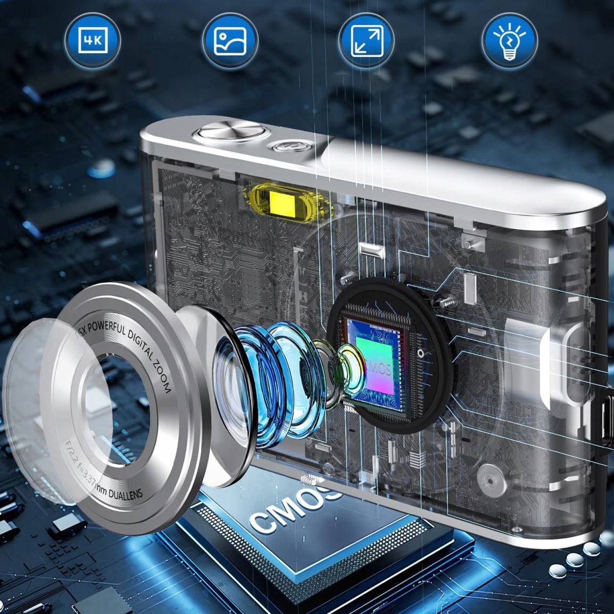 ✅-авто-ауто-функція та цифрова камера Full HD 4K: Цифрова камера з функцією автофокусування, натисніть затвор до половини, щоб встановити фокус, щоб отримати різкі та чіткі зображення, Mini Камера ІТ підтримує високоякісні фотографії 48 Мп та запис відео 4K HD. Вдосконалена технологія CMOS забезпечує точні деталі, записує живі моменти та залишає незабутнє враження. Цифрова камера підтримує картки пам'яті потужністю від 4 ГБ до 256 ГБ (включаючи 32 г карт пам'яті, які вам не потрібно купувати окремо). Переключіть передню камеру, щоб зробити селфі одним клацанням, а задню камеру для запису креативних фільмів, легко розблокуючи різні параметри фотографії. Ця камера VLOG підтримує вдосконалену функцію фокусування, яка забезпечує точний фокус переднього та заднього об'єктива, тому ви можете легко сфотографувати та легко записувати чіткі та чудові моменти. У функції мікрофона та анти -шока підключається до комп'ютера за допомогою USB -кабелю та служить веб -камерою для відео -розмов та передачі в прямому ефірі, що дозволяє обмінюватися чудовими моментами в соціальних мережах. Вбудована світлодіодна лампа покращує фотографування при слабкому освітленні та гарантує, що ваші фотографії та відео будуть світити в кожному середовищі. > Ця маленька туристична камера настільки легка, що ви можете легко покласти її в сумку і взяти її з собою. Невелика цифрова камера з 2,8-дюймовим екраном IPS оснащена двома акумуляторами на 700 мАг великою ємністю та довгим життям, тому ви можете замінити акумулятори та продовжувати фотографувати в будь-який час. Ця компактна камера ідеально підходить для реєстрації щасливих моментів з друзями та родиною.