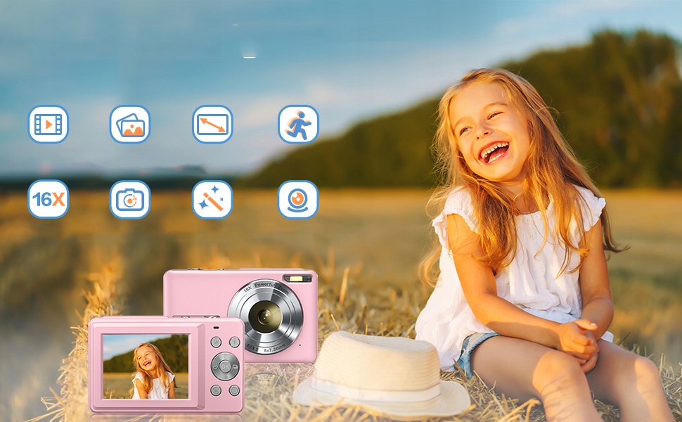 📸ten Компактна камера підтримує 16-кратний цифровий масштаб, а фотографії та відео можуть бути збільшені та зменшені, переміщуючи кнопку W/T. Вбудована лампа -начинка допомагає робити фотографії високої якості в темряві. Розетка зовнішнього штатива дозволяє підключити штатив, щоб зробити стабільні фотографії.