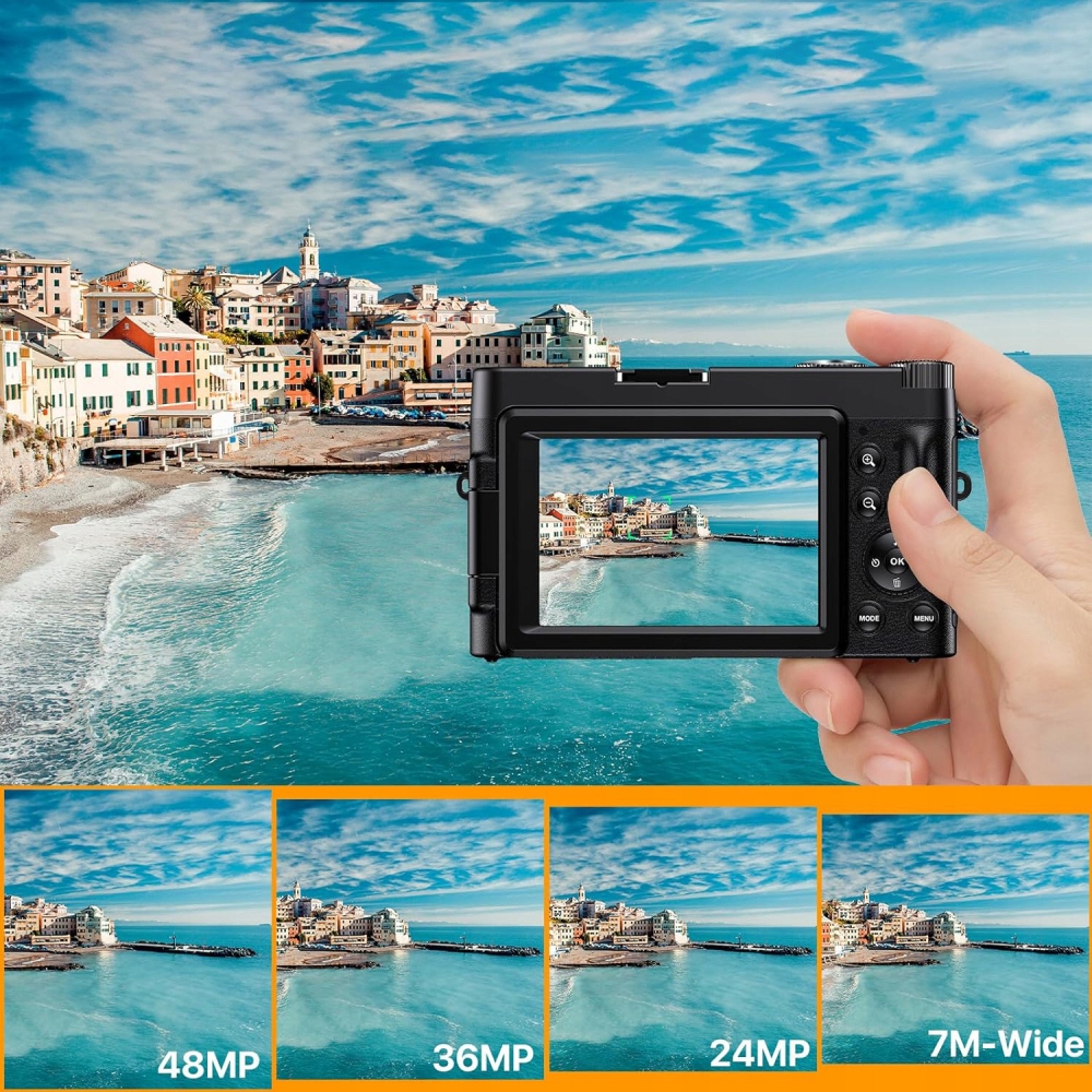 Ви можете використовувати цю цифрову камеру для створення відео 4K для YouTube. Ця камера 4K може знімати з роздільною здатністю 48 МП і підтримує 16-кратне цифрове збільшення, допомагаючи вам знімати та записувати найзахопливіші та незабутні моменти у вигляді високоякісних фотографій або відео, ідеальних для використання в приміщенні чи на вулиці. Ця камера для відеоблогерів 4K оснащена 3-дюймовим РК-екраном, який повертається на 180 градусів, щоб ви могли бачити вміст, який записуєте, або фоторамку під час ведення блогу.