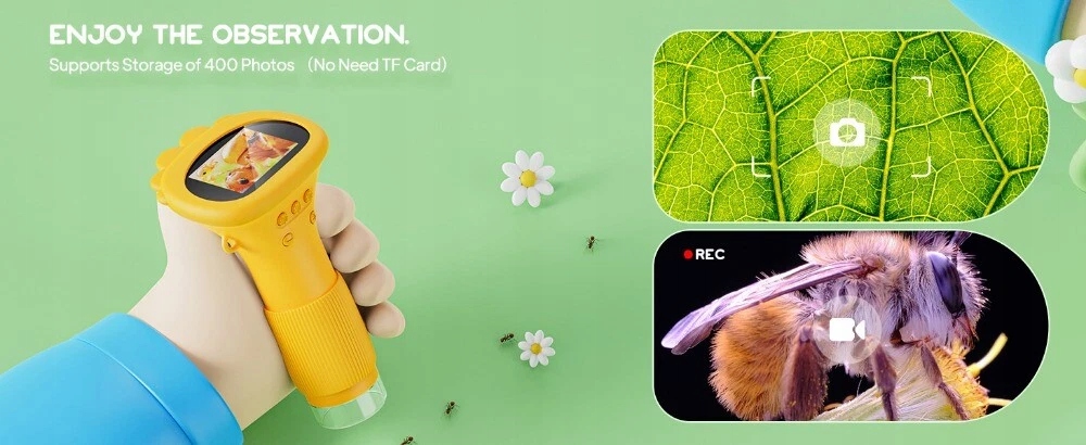 Кольоровий IP-дисплей з діагональною діагональною діагональ: Цей дитячий мікроскоп має 2-дюймовий екран захисту від очей HD з яскравими кольорами, що дозволяє вашим дітям легко відкрити мікроскопічний світ та пропонувати чіткі та інтуїтивні враження від спостережень у реальному часі; Збільшення 1000x може задовольнити більшість щоденних потреб