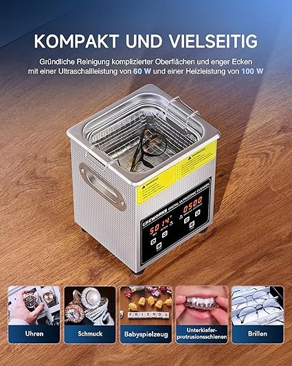 - Ультразвукова шайба 2 L - Ця промислова ультразвукова шайба використовує потужності 60 Вт для заповнення резервуара 2 л кавітаційних лез, використовуючи потужність їх невеликої імплозії для ретельного та професійного очищення навіть малих і складних поверхонь. Необхідні засоби для чищення, кладуть свої предмети в кошик, встановіть потрібний час на 30 хвилин і температуру до 80 градусів на цифровій панелі управління та натисніть кнопку живлення; Кавітація 40 кГц. споживання.