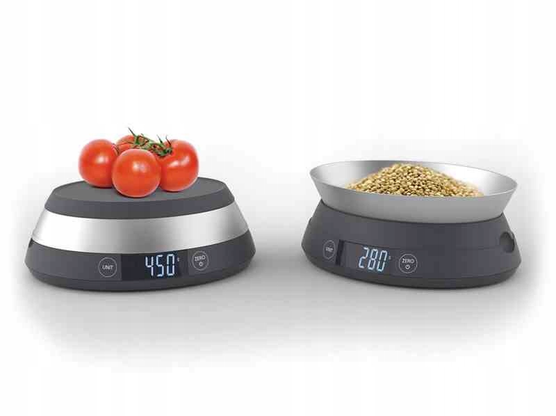 Вага складається з двох частин. Основа з РК -дисплеєм та чашею, яка є вагою, а також поверхонь, на яких продукція може зважувати сумочки або іншу упаковку. Звернувшись до миски, ви можете налити лояльні продукти.