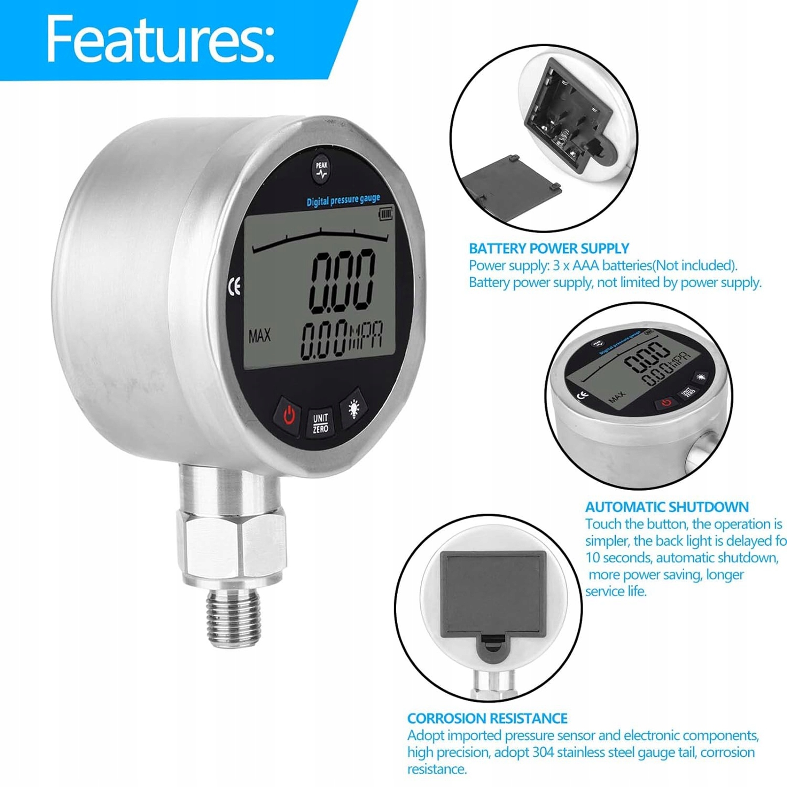 Особливість: 1. Діапазон вимірювань: Діапазон вимірювання тиску становить 0-400bar, 0-40mpa, 0-5800 фунт / кв.дюйм, з декількома одиницями дисплея для задоволення більшої кількості потреб вимірювання тиску.