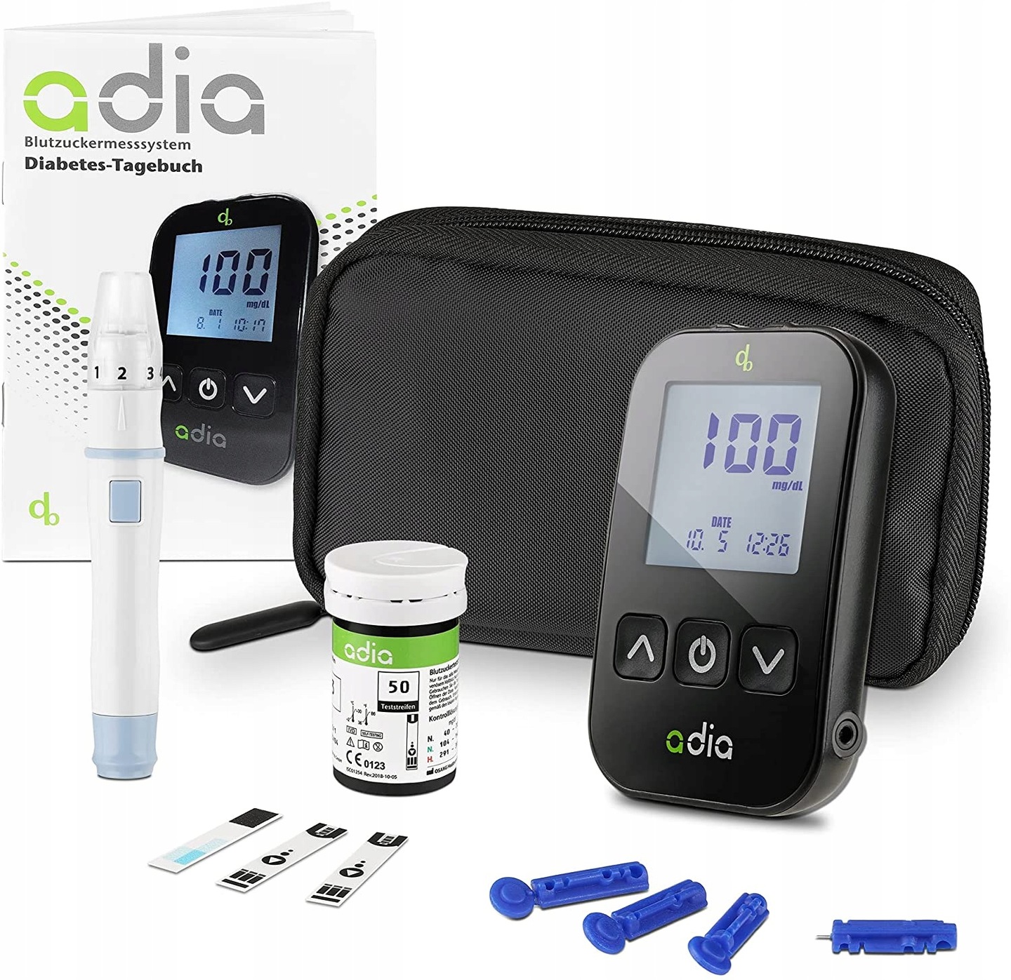 - Набір для самотестування для діабетиків включає: 1 глюкометр adia (ммоль, переважно для Східної Німеччини), 13 тест-смужок, 1 пірсинг допомога, 3 ланцети, 1 короткий посібник користувача (може бути недоступним польською), 1 щоденник діабету