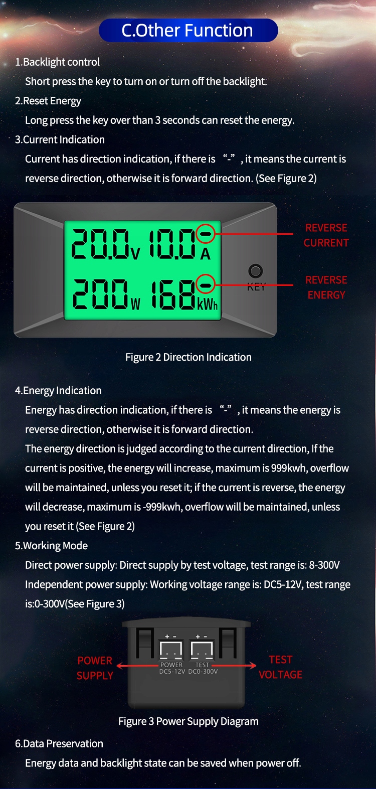 4. Індикація енергії має вказівку напрямку, якщо це «-», це означає, що енергія йде у зворотному напрямку, інакше це напрямок вперед. Напрямок енергії визначається відповідно до напрямку струму, якщо струм позитивний, енергія збільшиться, максимум 999 кВт/год, переповнення буде підтримуватися, якщо ви не скинете його; якщо струм зворотний, енергія зменшиться, максимум становить -999 кВт/год, переповнення триватиме, доки ви не скинете його
