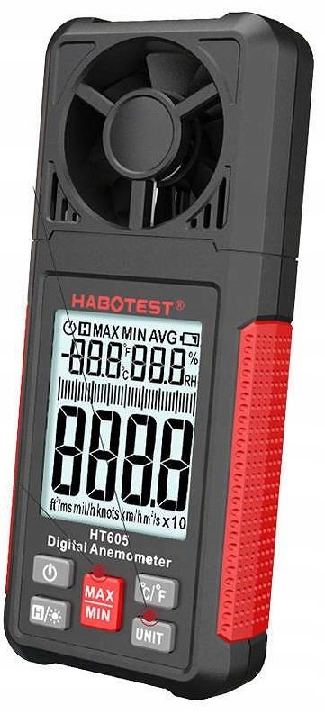 Habotest HT605 — практичний цифровий анемометр, який дозволяє вимірювати швидкість вітру, температуру та об’єм. Він оснащений вентилятором із вісьмома лопатями та дозволяє регулювати одиниці вимірювання. Він живиться від 3 батарейок типу ААА (входять в комплект), а також нагадує про низький рівень заряду батареї. РК-дисплей надасть вам найважливішу інформацію про роботу приладу.