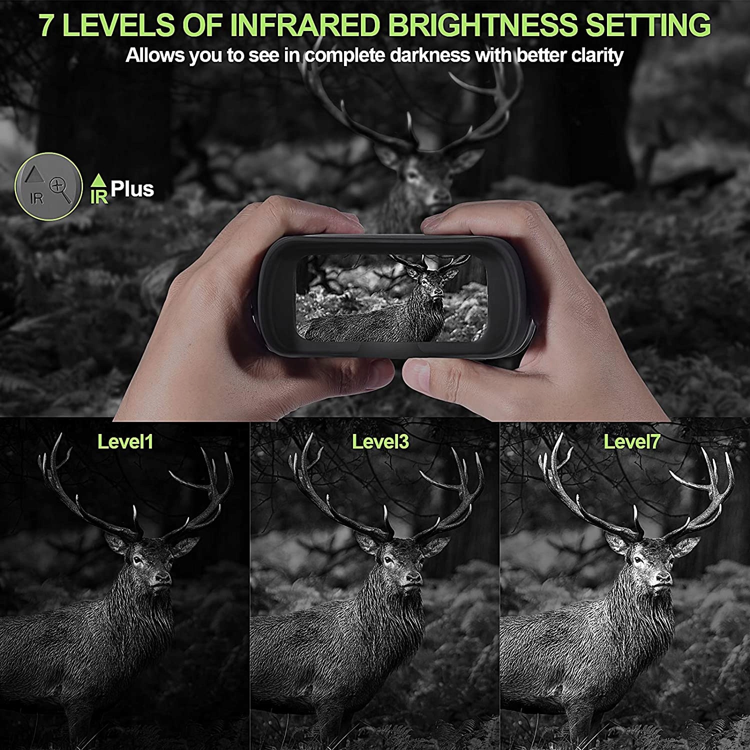 Вбудований світлодіодний інфрачервоний промінь 850 NM, окуляри нічного бачення ZIMOCE дозволяють спостерігати за дикими тваринами в темному лісі. Потужний ІЧ-світлодіод потужністю 3 Вт дозволяє бачити до 300 метрів у повній темряві. Він оснащений спеціальним датчиком зіркового світла, який забезпечує чіткіші нічні зображення, випромінюючи дуже слабке світло в темряві. Завдяки 7 рівням інфрачервоного підсвічування ви можете адаптуватися до навколишнього освітлення.