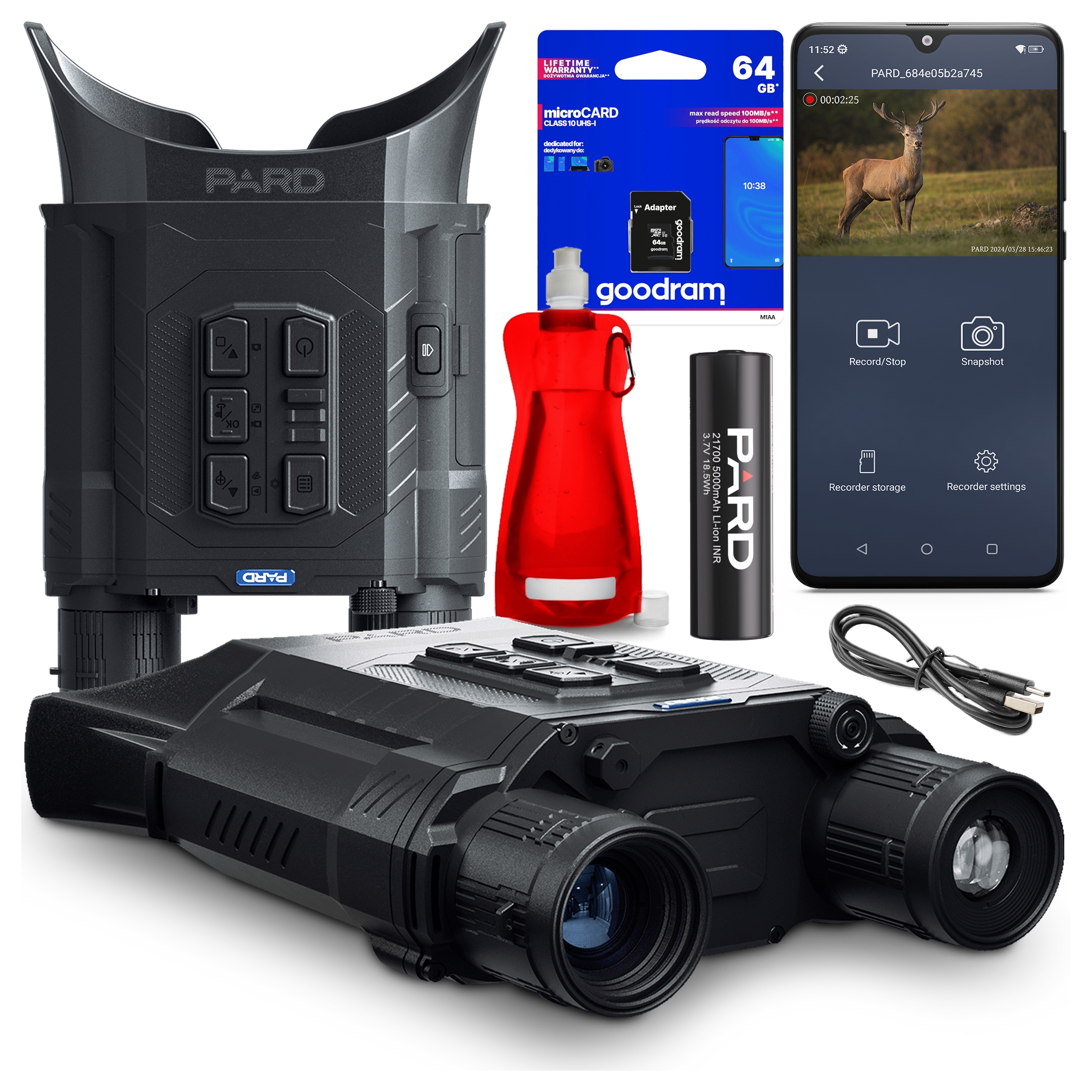 Пристрій дозволяє записувати відео та зробити фотографії, які зберігаються на карті microSD до 128 ГБ. Завдяки вбудованому Wi-Fi і програмі PardVision2 ви можете передавати відзнятий матеріал безпосередньо на свій телефон і навіть використовувати смартфон як дистанційний видошукач.