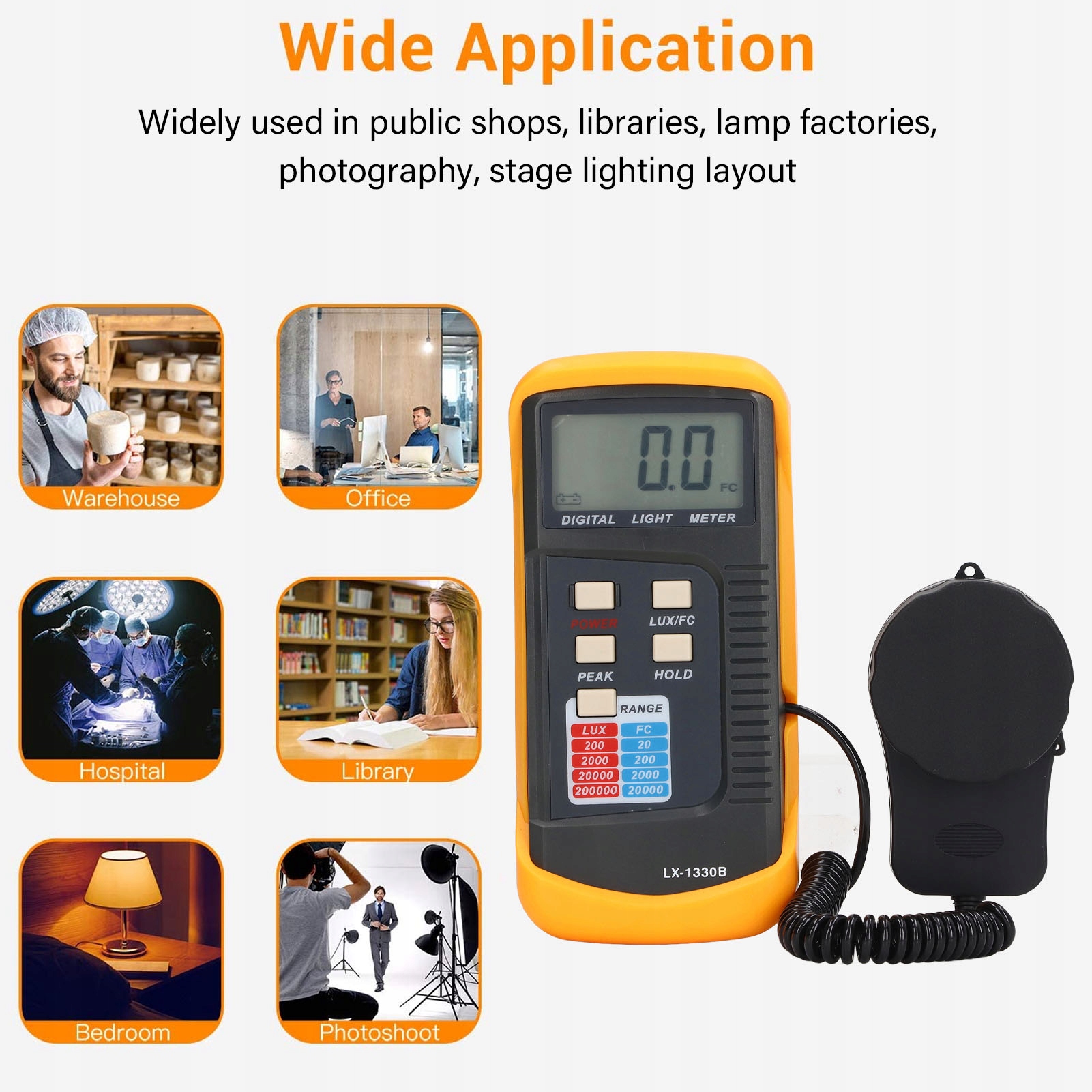 5. Широке застосування: Лічильник освітлення можна широко використовувати в тесті освітлення державних магазинів, бібліотек, світлі фабрики, фотографії, розташуванні сценічного освітлення тощо