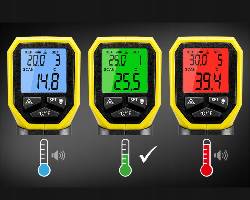 - Безконтактне вимірювання температури поверхні в діапазоні від -50 °C до + < /ul>
