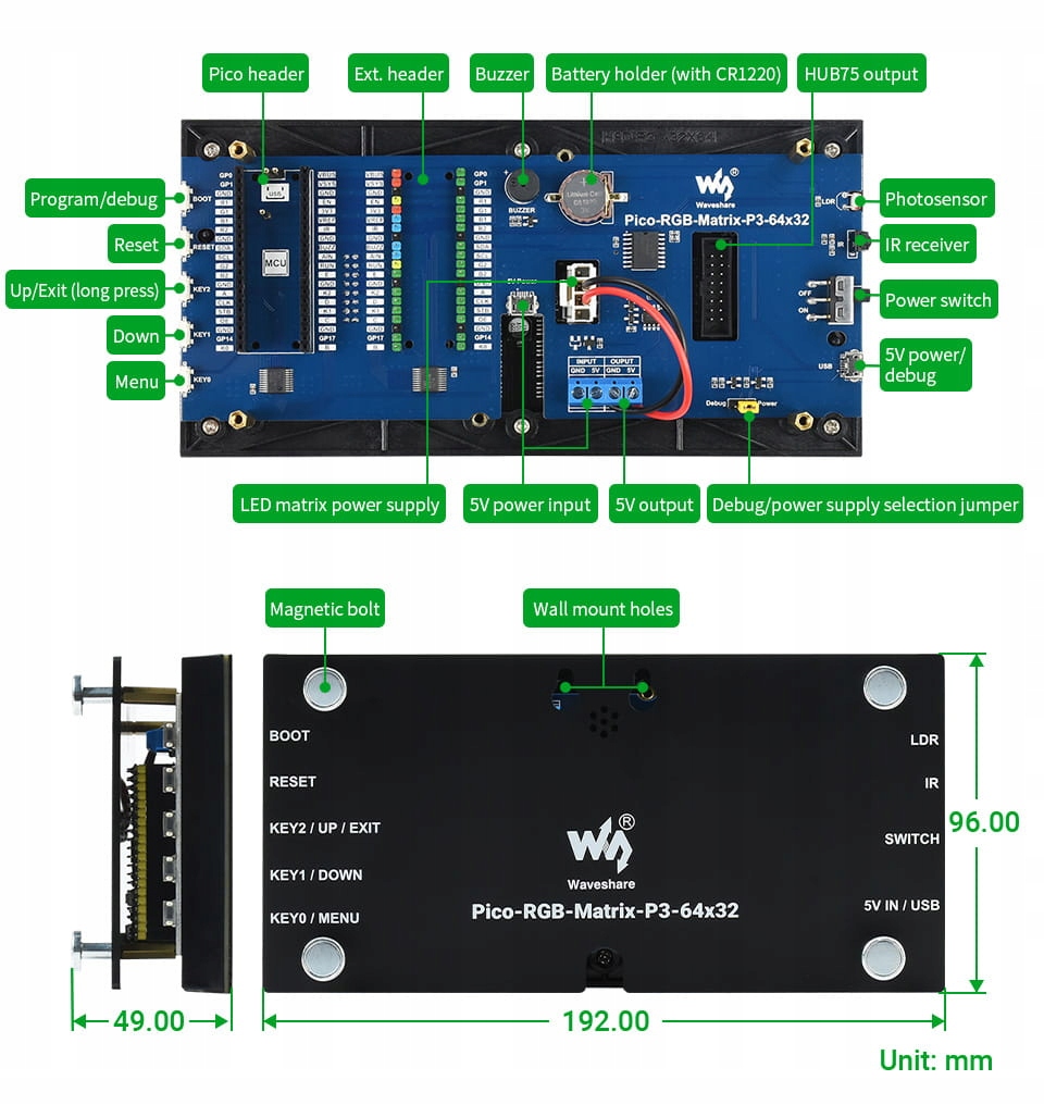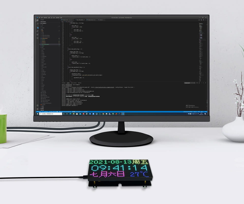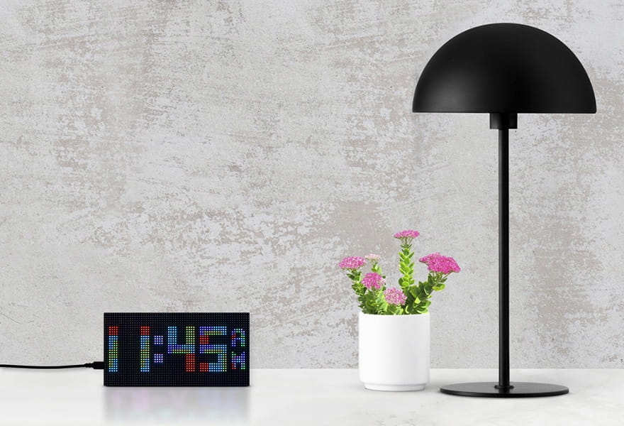 Це цифровий годинник зі світлодіодною матрицею RGB, розроблений для Raspberry Pi Pico. Містить високоточну мікросхему RTC DS3231, фотодатчик, зумер, інфрачервоний приймач і кнопки, він має багато функцій, зокрема точний електронний годинник, дисплей температури, автоматичне регулювання яскравості, будильник і налаштування кнопок.