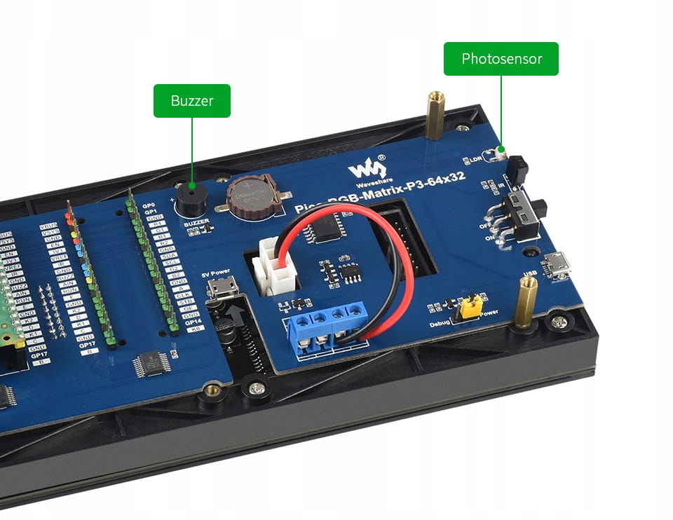 Фотосенсор дозволяє автоматично регулювати яскравість за рахунок навколишнього освітлення. Зумер можна використовувати для будильника, погодинної мелодії або відтворення музики.