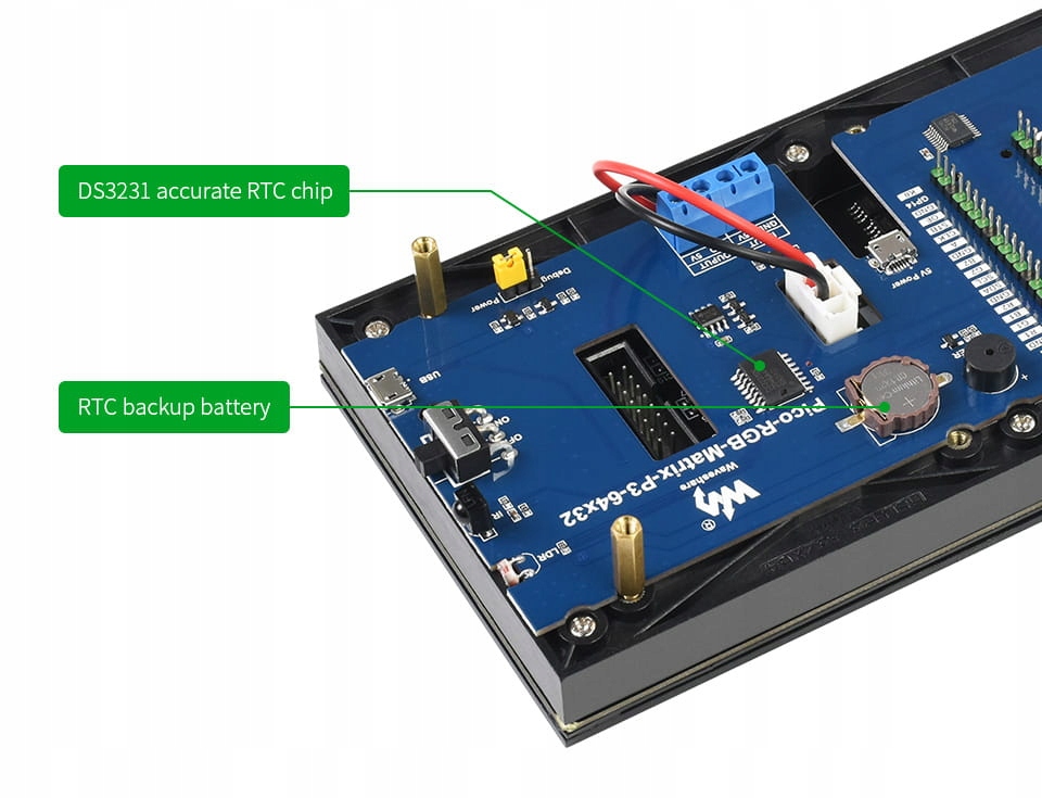Містить високоточну мікросхему DS3231 RTC із вбудованим датчиком температури. Резервна батарея забезпечує постійний час після втрати живлення.