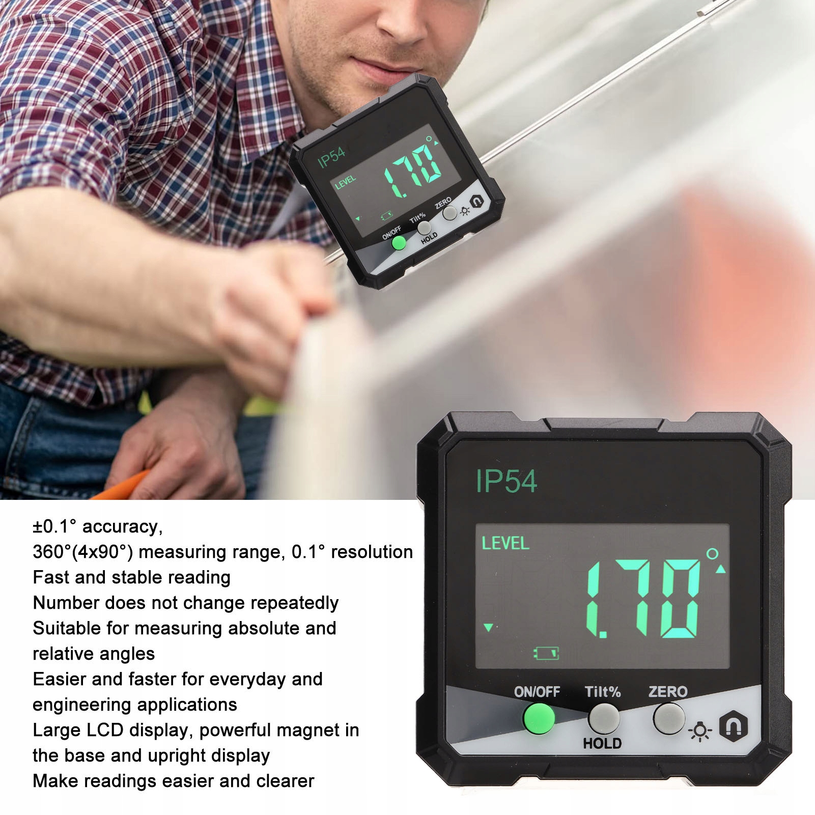 1, ПОРТАТИВНИЙ ТА ПОТУЖНИЙ: Цифровий гоніометр невеликий і легкий, його легко носити та використовувати, він має потужний вбудований магніт на основі, який можна прикріпити до будь-якого залізна поверхня, підходить для настільної пилки, ремінця для годинника, швидкої та легкої пилки, металевих прутів, круглих труб тощо. Інклінометр особливо підходить для роботи на драбинах, дахах та інших небезпечних місцях 2, ТОЧНО ТА ШВИДКО: точність прилад для вимірювання кута ± 0,1°, діапазон вимірювання 360° °(4x90°), роздільна здатність 0,1°, читання цифрового транспортира може бути швидким і стабільним, число не змінюється повторно 3, АБСОЛЮТНІ ВІДНОСНІ КУТИ : Магнітний гоніометр підходить для вимірювання абсолютних і відносних кутів, що робить цей транспортир легшим і швидшим для повсякденного та інженерного застосування 4. ЧІТКИЙ ДИСПЛЕЙ: кутомір розроблено з великим РК-дисплеєм, сильним магнітом у основі та вертикальним дисплей, що робить зчитування легшим і чіткішим 5. КІЛЬКА ФУНКЦІЙ: Цей цифровий інклінометр є необхідним інструментом для комерційних і житлових проектів, може використовуватися в оздобленні, столярній справі, будівництві, кладці, машинобудуванні, автомобілів та інших галузях. Наприклад, ви можете використовувати цей косинець із настільною або торцювальною пилкою