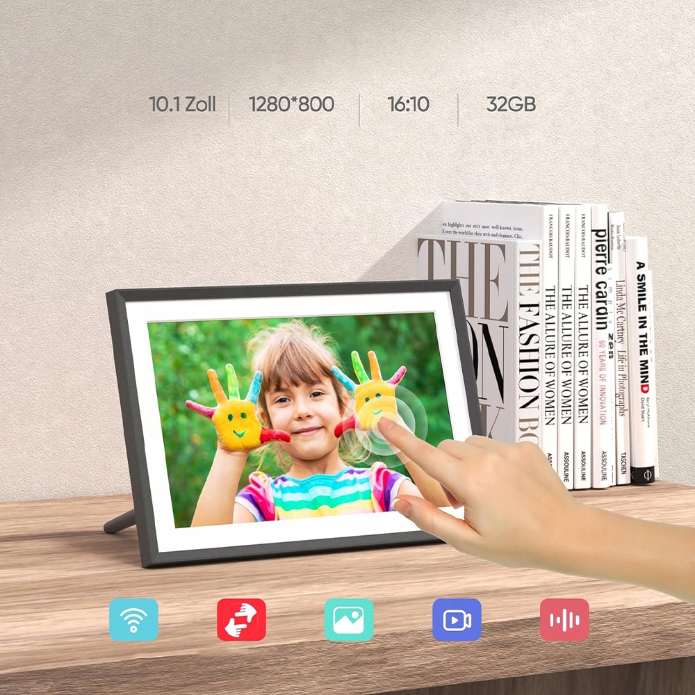 Вбудована -in 32 ГБ пам'яті містить десятки тисяч фотографій та підтримує SD -карту 128 ГБ (не потрапляє в обсяг доставки) для управління файлами. Цифрова фоторамка оснащена інтуїтивно зрозумілим інтерфейсом користувача, який простий у використанні навіть для нетехнічних людей. Підтримка понад 20 мов.