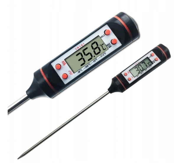 - Компактні розміри та легкість Використання - Термометр має компактні розміри та оптимально довгу голку для вимірювання, що робить його використання дуже простим. Пристрій легкий, зручний і надійно лежить у руці, що полегшує керування цим кухонним гаджетом. На дисплеї є кнопки з написами, що спрощує роботу. Товар має футляр у вигляді пластикової трубки.
