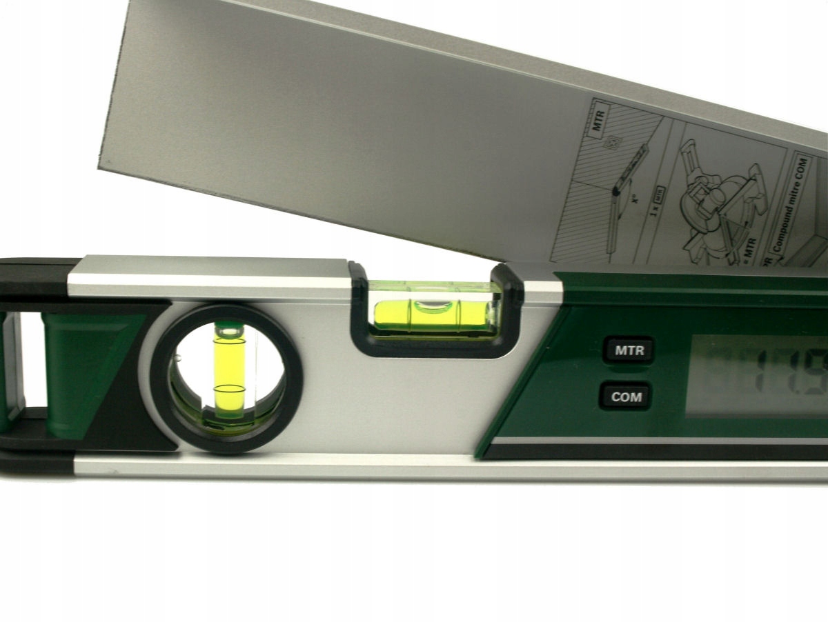 2 дуже точні бульбашкові рівні (точність 1,5 мм/м), завдяки яким ми можемо перевіряти відхилення від вертикалі та горизонталі та можемо використовувати транспортир як традиційний ватерпас