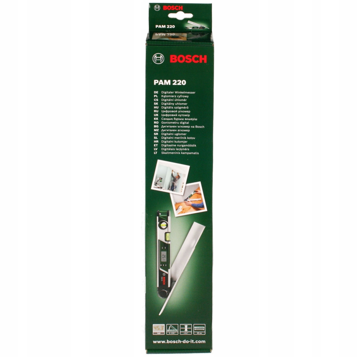 Цифровий транспортир BOSCH, модель PAM 220, обчислює кути дуже точно, є швидшим, точнішим і, головне, економнішим, ніж інші методи вимірювання. Він надзвичайно простий у використанні і не тільки вимірює кути з точністю +/- 0,2°, але й точно передає їх на інші елементи. Завдяки транспортиру PAM 220 виключається ризик допущення помилок через громіздке використання шаблонів і виправлення помилок побудови, що виникають внаслідок неправильного розрахунку кутів. Просто ввімкніть транспортир, зчитайте результат вимірювання, перенесіть його на елемент і все. Великий цифровий індикатор на передній панелі приладу дозволяє зчитувати результат вимірювання в будь-яких умовах. Завдяки міцній конструкції кутомір BOSCH PAM 220 можна використовувати в складних будівельних умовах. Новим є вбудовані математичні функції, що полегшують співпрацю з торцювальними пилками (торцовочними пилами), завдяки яким транспортир дуже швидко розраховує та відображає на дисплеї, який кут скосу потрібно встановити на торцювальній пилці, щоб отримати заданий кут. Ця функція дозволяє автоматично обчислювати прямі кути, кути подвійного скосу та кути нахилу на торцювальній пилці.