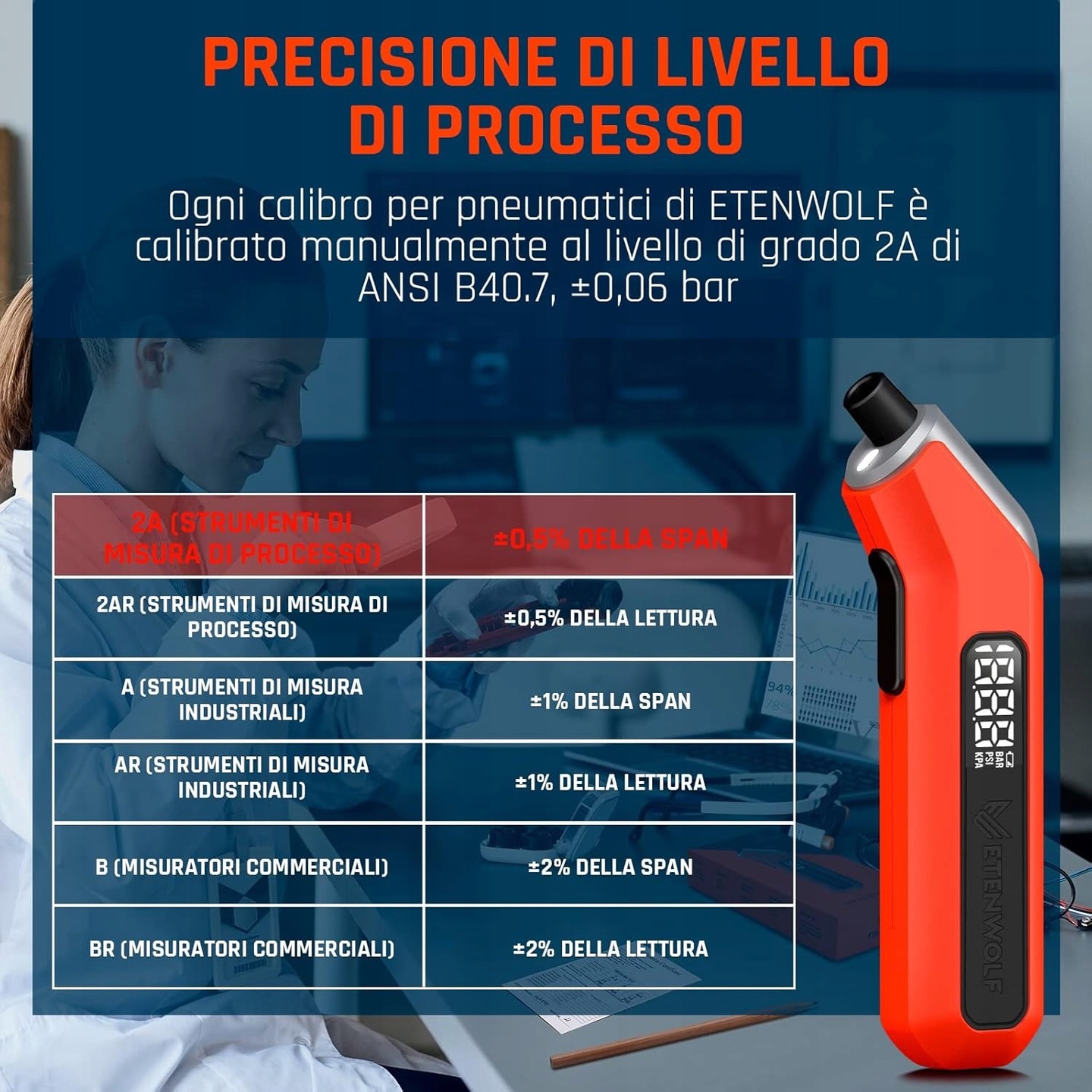 Висока точність вимірювань – кожен манометр ETENWOLF калібрується вручну відповідно до стандарту ANSI B40.7 рівень 2A, що забезпечує точність ±0,06 бар.