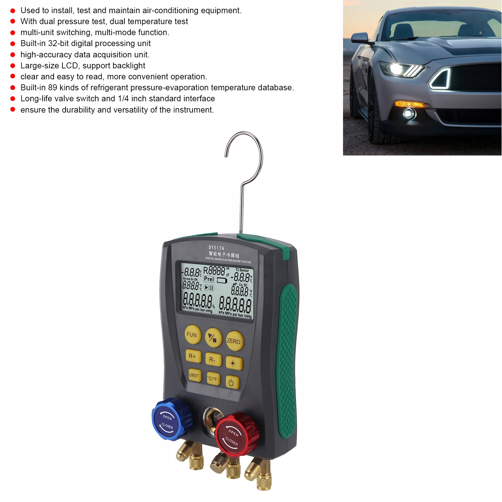 2. З подвійним випробуванням тиском, подвійним випробуванням температури (потрібний тестовий кліп, не входить), цифрове зчитування, перемикання кількох блоків, автоматичне перетворення температури за Цельсієм/Фаренгейтом, багаторежимна функція та вбудована база даних холодоагенту.