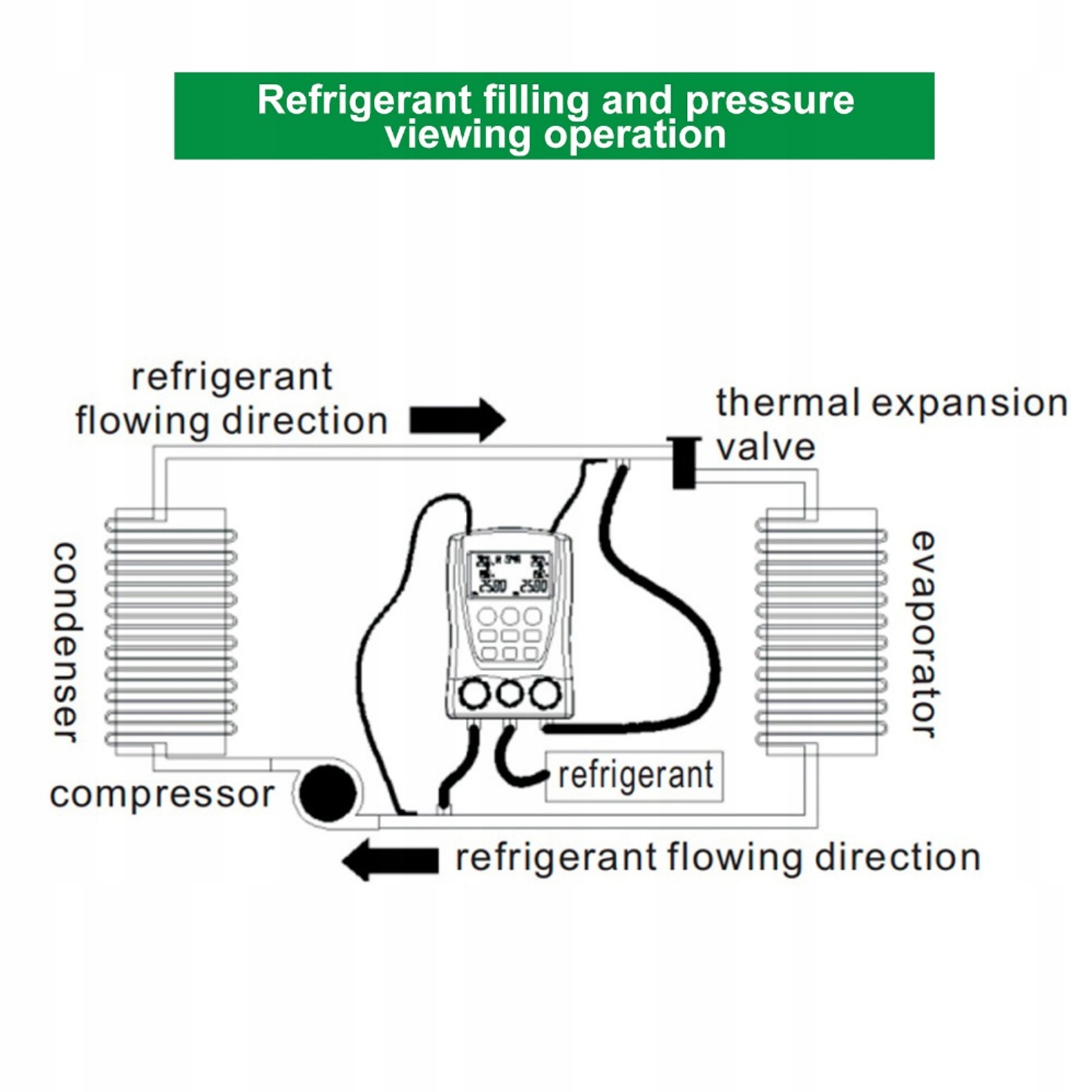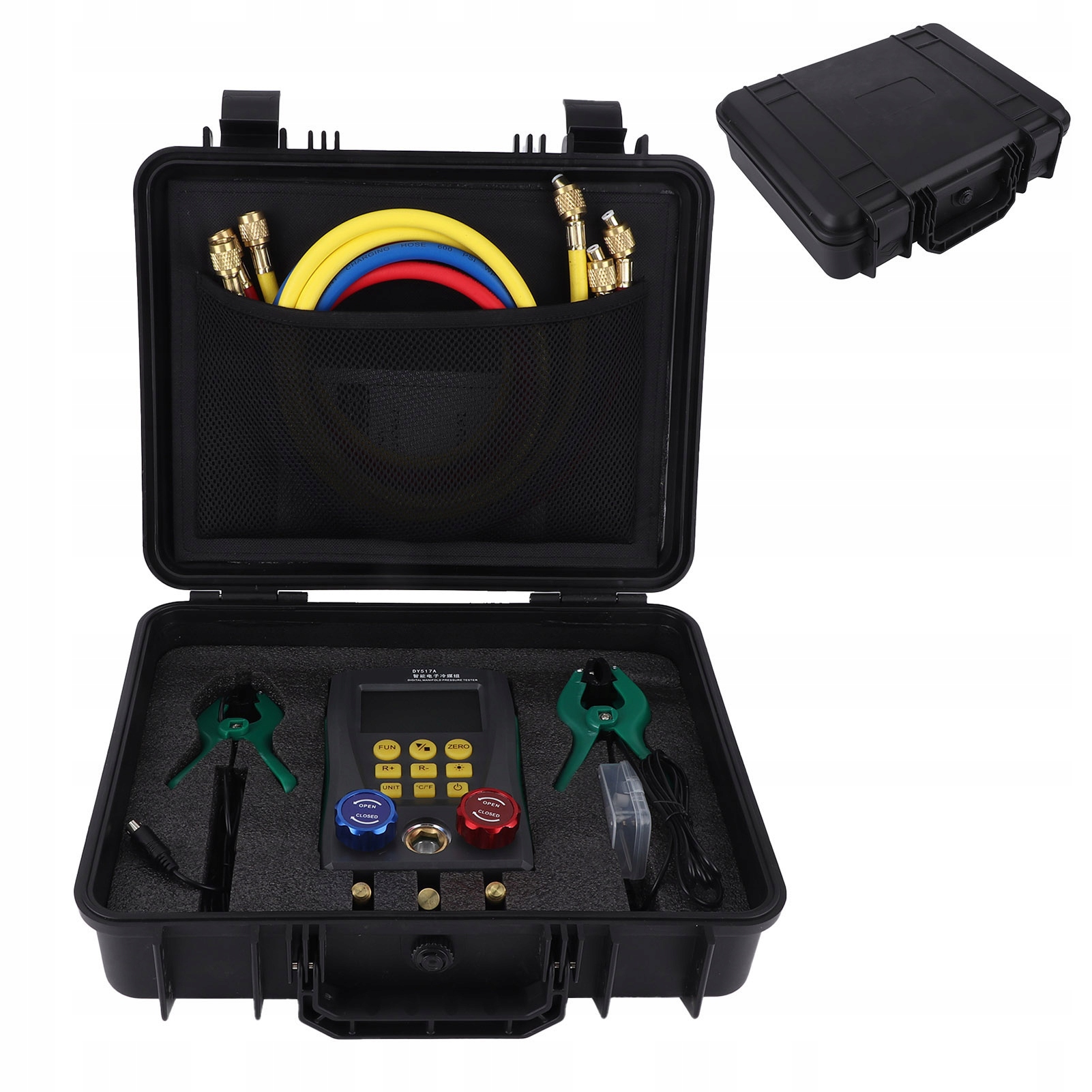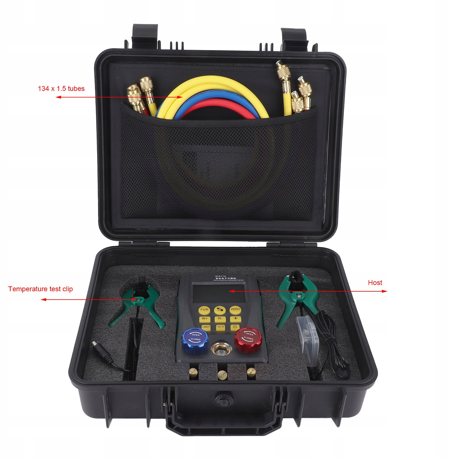 2. З подвійним випробуванням тиском, подвійним випробуванням температури (потрібний тестовий кліп, не входить), цифрове зчитування, перемикання кількох блоків, автоматичне перетворення температури за Цельсієм/Фаренгейтом, багаторежимна функція та вбудована база даних холодоагенту.