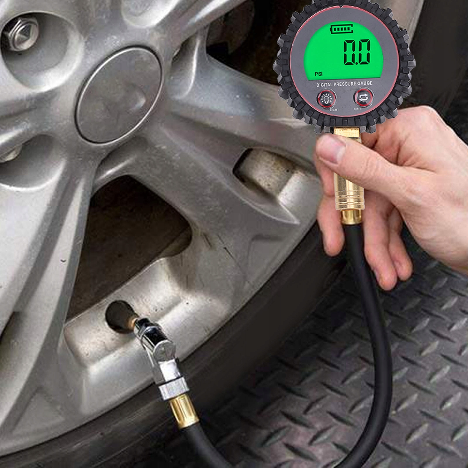 4. Вимірювання без зусиль: хоча механіки рекомендують перевіряти тиск у шинах щотижня, відвідування гаража чи заправки може бути незручним. Наш цифровий манометр у шинах дозволяє вимірювати тиск повітря у зручний для вас час. Просто підключіть його до повітряного клапана вашої шини, щоб отримати миттєве й точне зчитування.