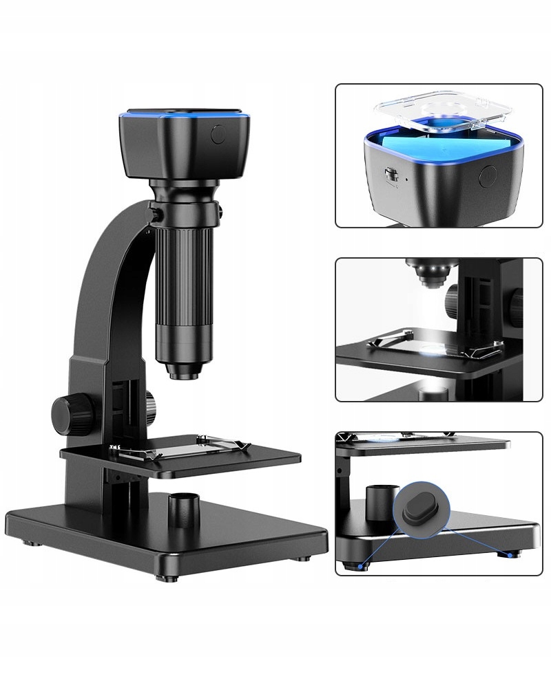 Цифровий мікроскоп USB зі світлодіодним підсвічуванням дозволяє відображати те, що ви переглядаєте, зображення на екрані комп’ютера, планшета чи телефону у якості Full HD. Працює як фотоапарат – зображення є транслюється в прямому ефірі - в реальному часі - забезпечує постійний попередній перегляд поля спостереження та можливість запису фотографій. Він оснащений світлочутливою матрицею з роздільною здатністю 12 мегапікселів.