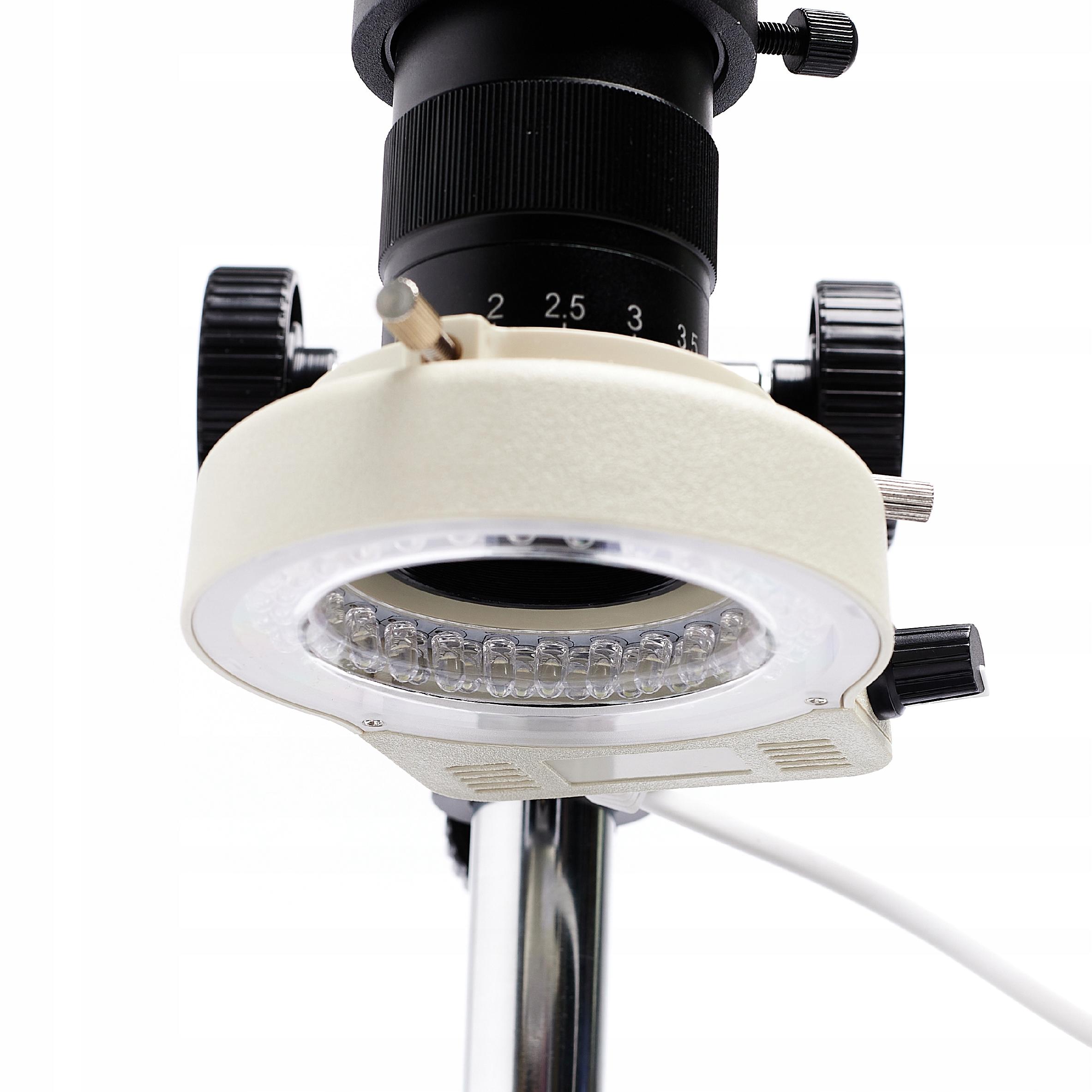 Джерело світла зі світлодіодами з диммером. Діаметр кільця всередині 60 мм, зовнішній – 95. Кільцевий освітлювач забезпечує прохолодне, рівномірне, інтенсивне та сфокусоване освітлення без тіней.