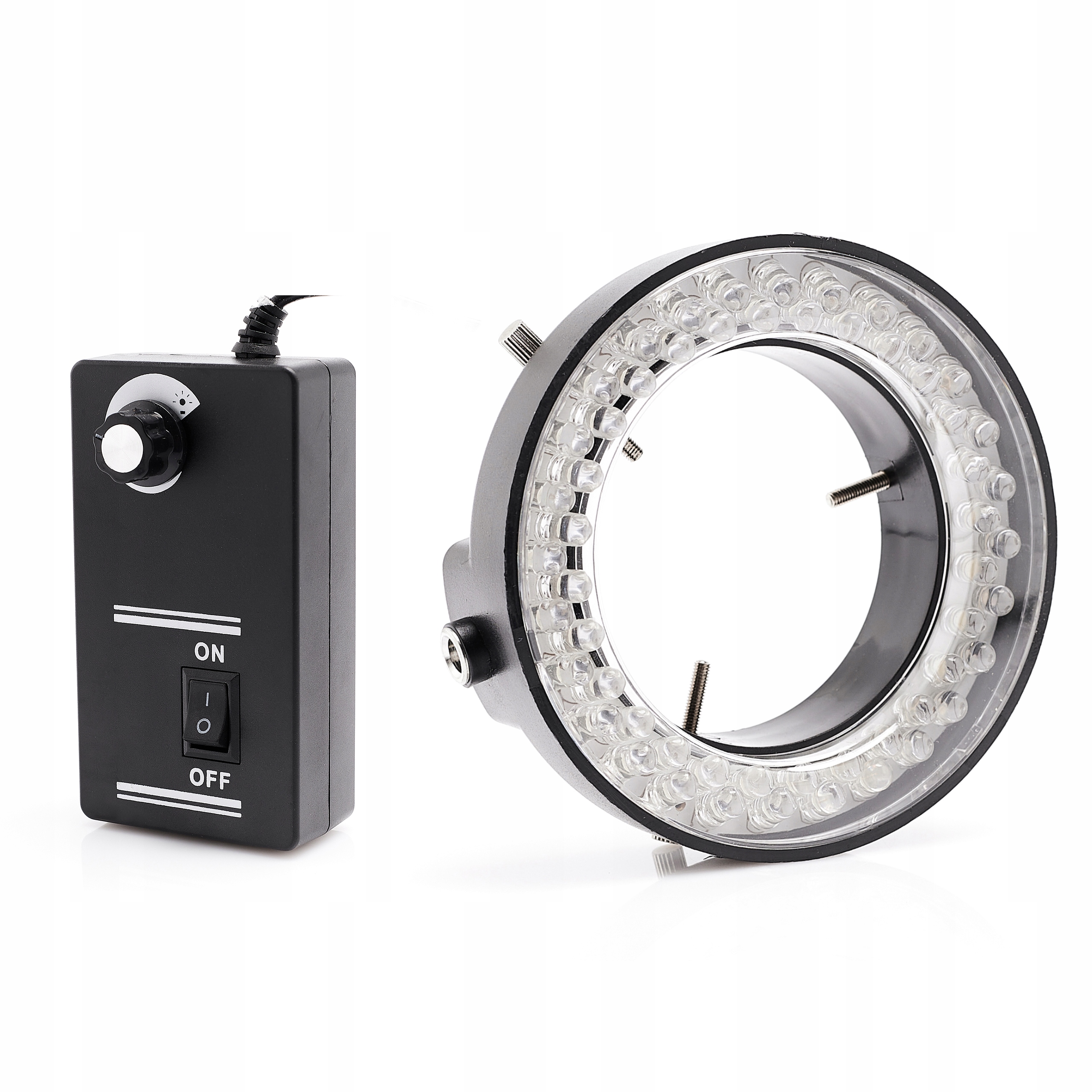 Джерело світла зі світлодіодами з диммером. Діаметр кільця всередині 60 мм, зовнішній – 95. Кільцевий освітлювач забезпечує прохолодне, рівномірне, інтенсивне та сфокусоване освітлення без тіней.