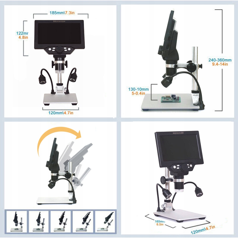 Мікроскоп G1200 із 7-дюймовим РК-екраном, ручку можна повертати на будь-який кут вперед і назад відповідно до ваших потреб, а об’єктив підтримує 1-1200-кратне безперервне масштабування. Це точно може стати хорошим помічником у вашій щоденній роботі.