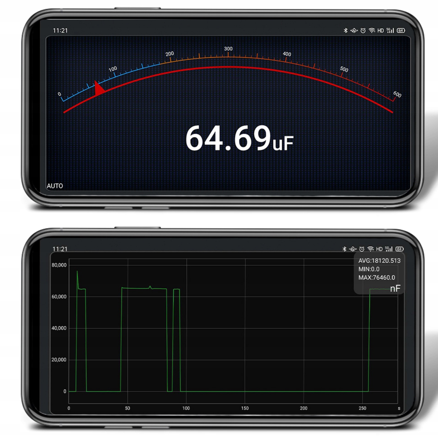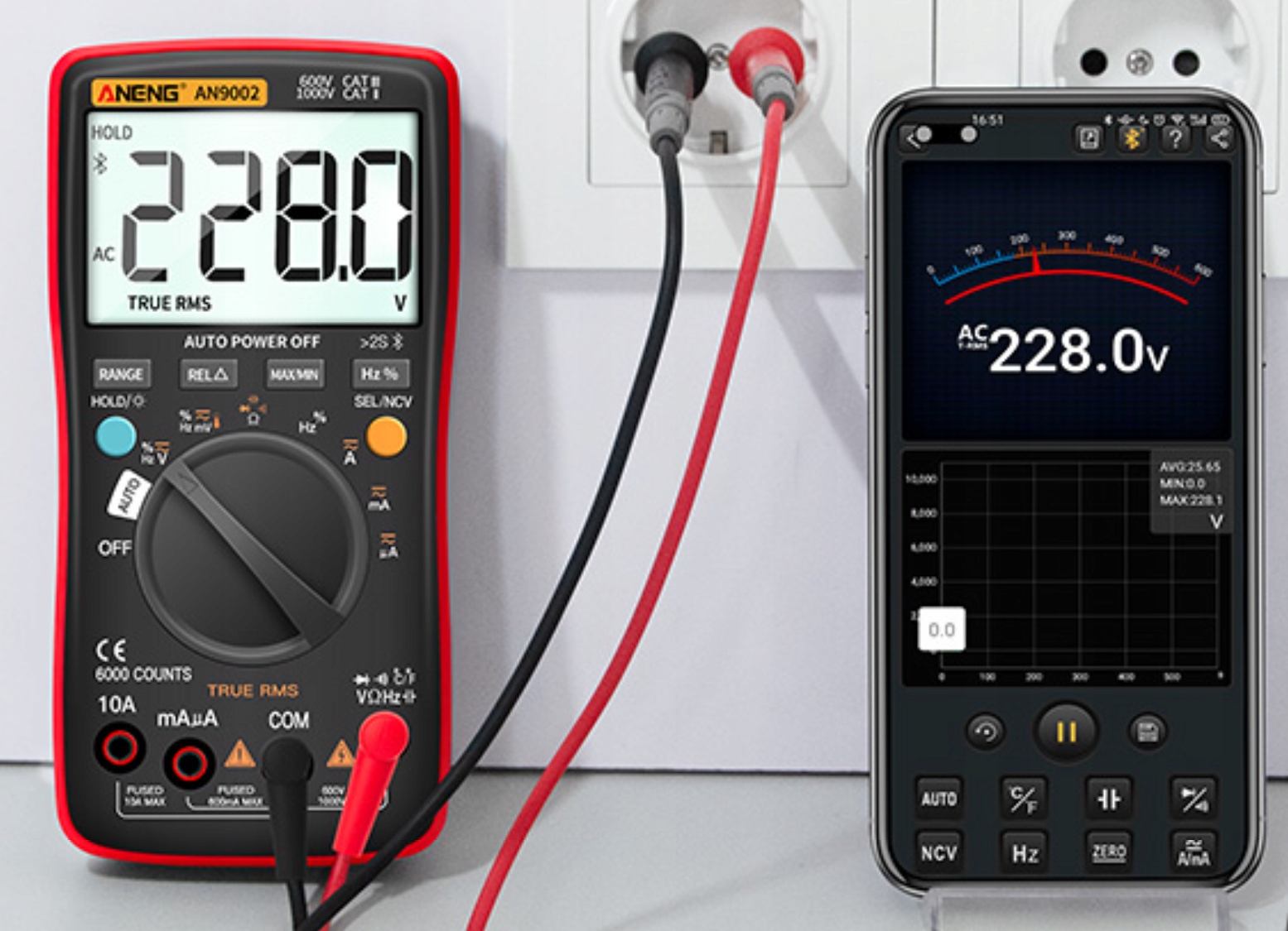 Крім того, вимірювання ємності, частоти, наповнення і температури не вимагає використання додаткових приладів, всі функції включені в один прилад. Відмінною особливістю лічильника AN9002 є можливість перевірки розеток з функціями виявлення фази і нуля за допомогою одного щупа. Крім того, в глюкометрі є модуль Bluetooth, що дозволяє бездротове підключення до програми на телефоні або планшеті. Таким чином ми отримуємо можливість спостерігати за змінами параметрів на діаграмі та зберігати результати у файлі.