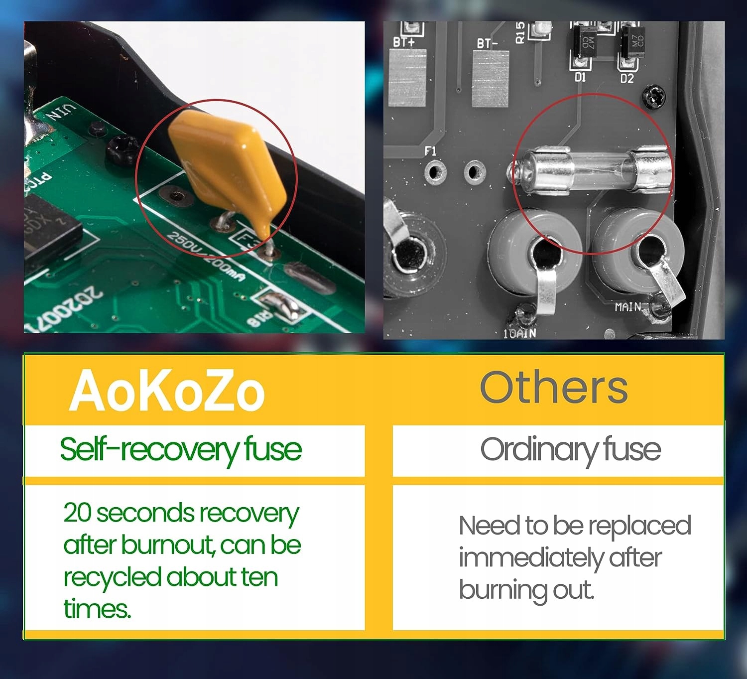 Запобіжник із самовідновленням відновлюється приблизно через 20 секунд після перегорання та може бути перероблений приблизно 10 разів (звичайні запобіжники потрібно замінити одразу після перегоряння та не підлягають переробці). p >