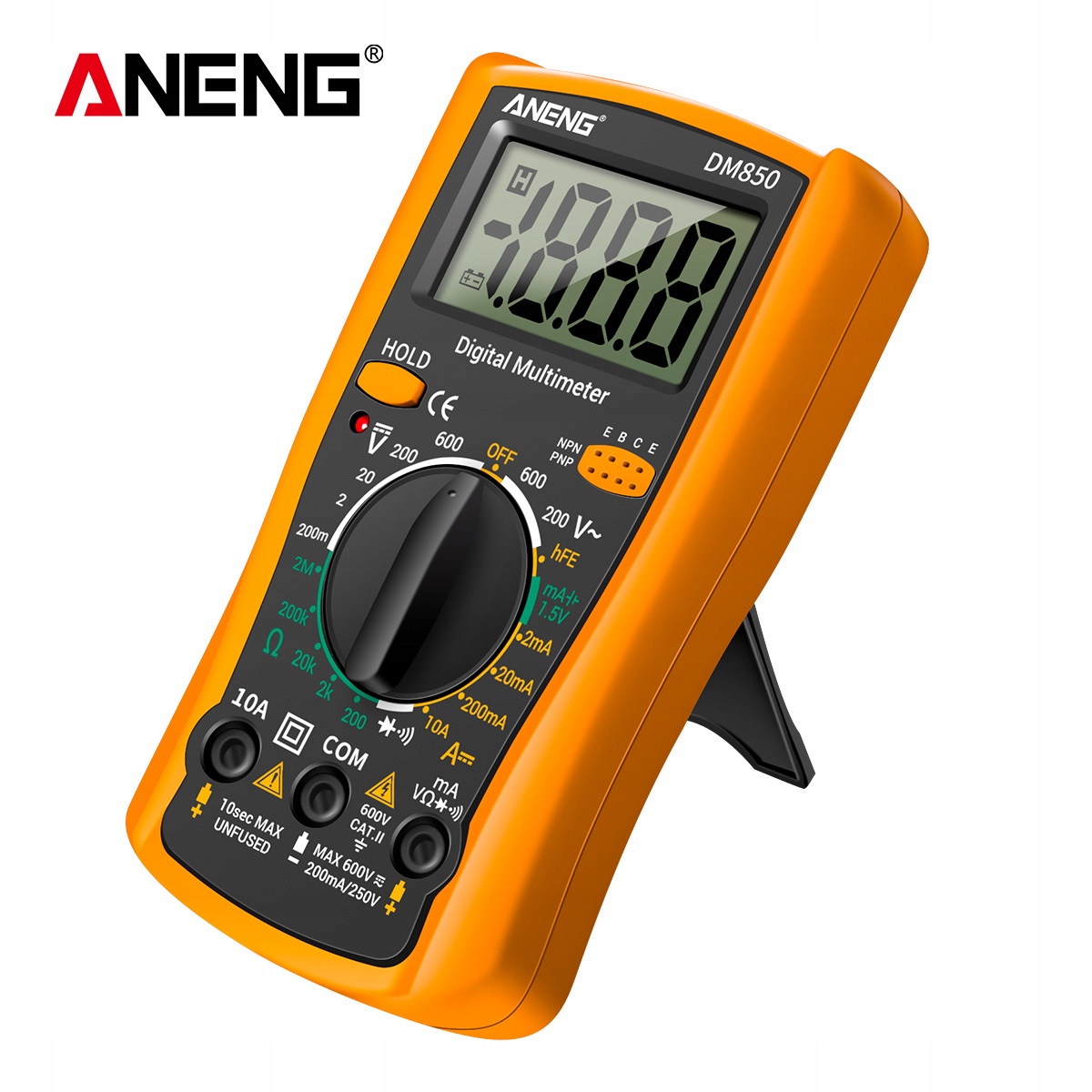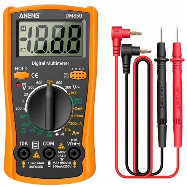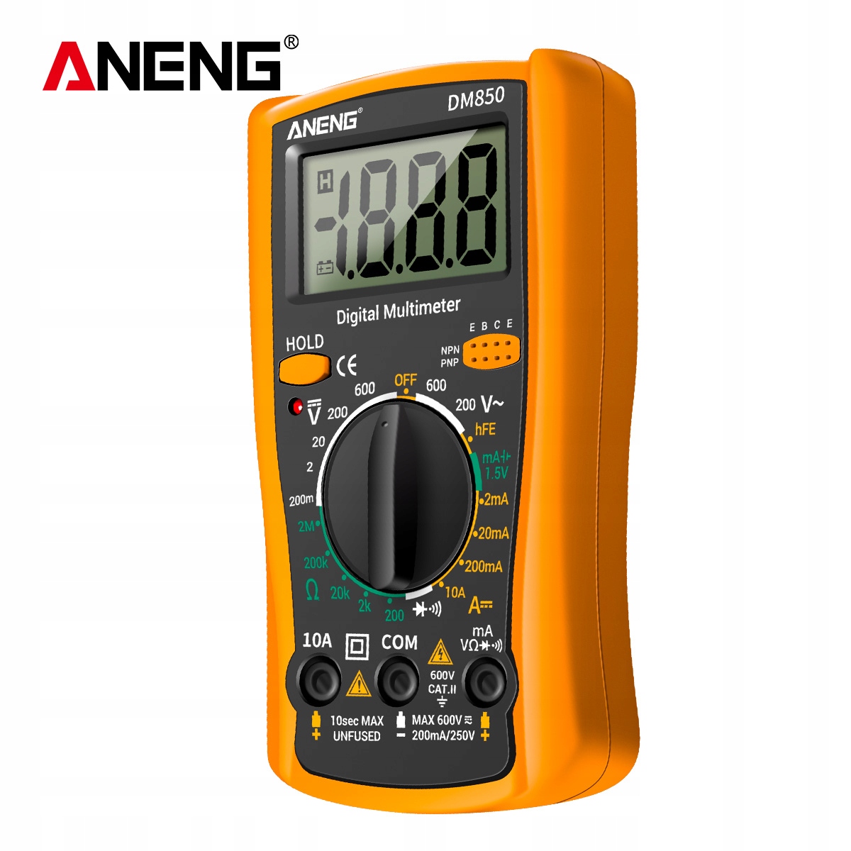 Універсальний вимірювальний прилад ANENG DM850 — це зручний і універсальний мультиметр, який ідеально підходить для майстерні, сервісного центру або автомобіля. Він дозволяє вимірювати високі діапазони змінного/постійного струму та напруги, а також вимірювати малі постійні струми. Ми будемо використовувати вимірювач для перевірки випрямних діодів і світлодіодів, транзисторів NPN і PNP, а також цілісності ланцюга. Завдяки цьому ми можемо вимірювати значення опору, пряму напругу діодів, безперервність ланцюга або hFE біполярних транзисторів.