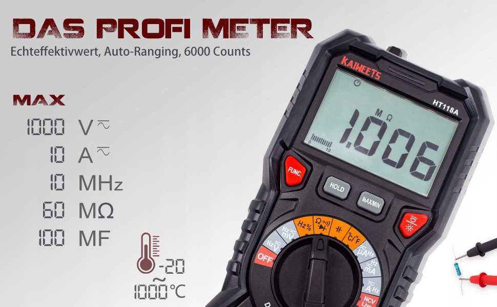 - ✅ Професійний пристрій: RMS вимірювання з автоматичним діапазоном (True-RMS). Універсальний пристрій, який вимірює напругу змінного/постійного струму, струм змінного/постійного струму, ємність, температуру, частоту, час увімкнення, опір, безперервність і перевіряє діоди та провідники Фансена. Великий діапазон вимірювань, висока точність. Це робить його придатним як для профільної зони, так і для домашнього господарства.