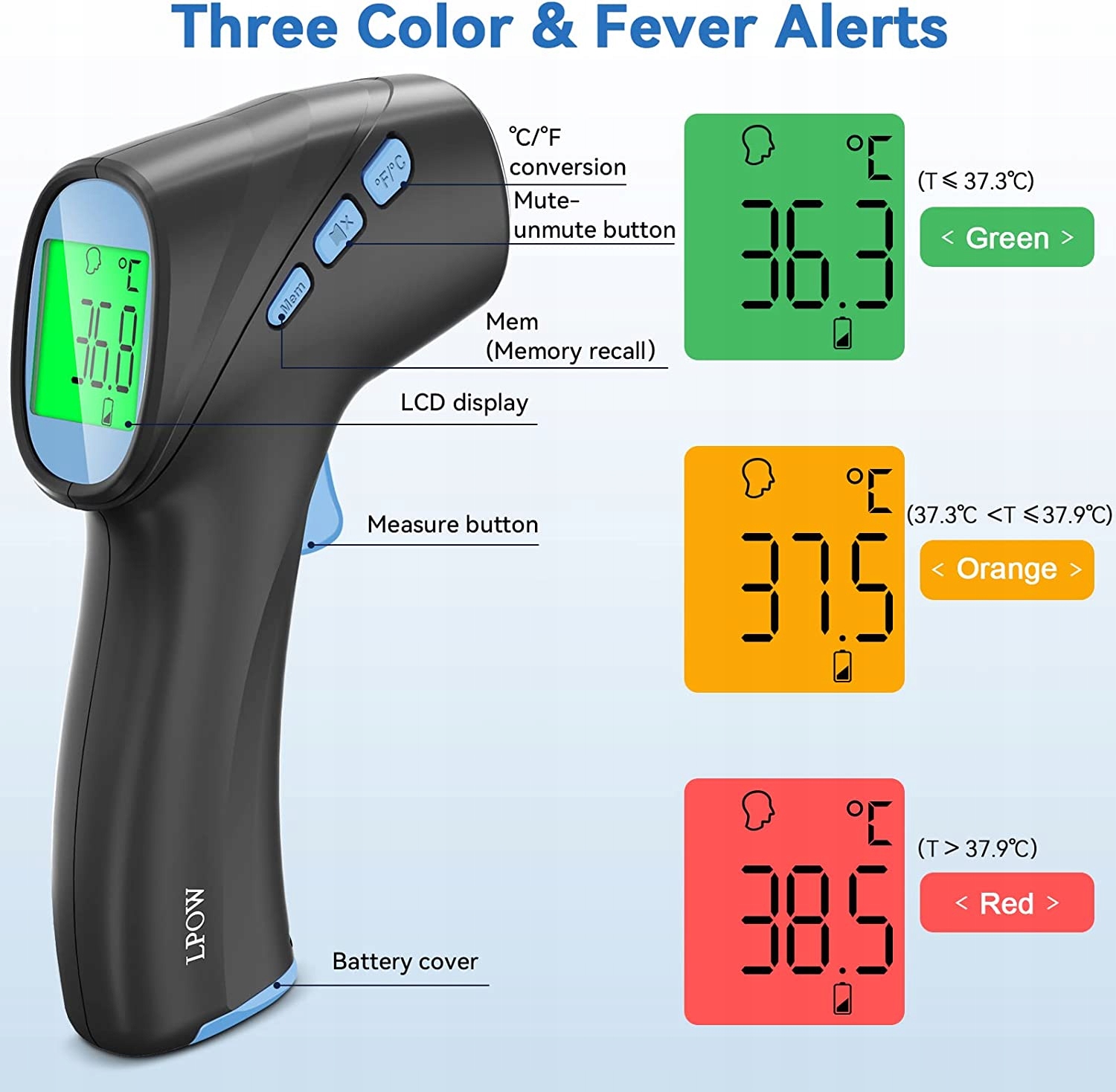 Точне вимірювання: Натисніть кнопку вимірювання, і результат відобразиться за 1 секунду. Ми можемо швидко виміряти свою температуру за допомогою цього термометра лихоманки всередині та зовні. Сучасні гарячкові термометри з високою чутливістю забезпечують безпечну високу точність