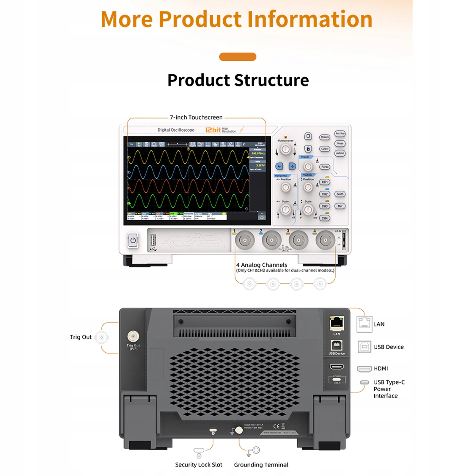 4. Орієнтований на користувача дизайн і розширені функції: має 7-дюймовий всенаправлений дисплей з елементами керування, як у смартфоні, і настроюваними ярликами. Підтримує розширені апаратні тригери та декодування (UART, I2C, SPI, CAN, LIN тощо), а також 43 автоматичні вимірювання з розширеними математичними операціями.
