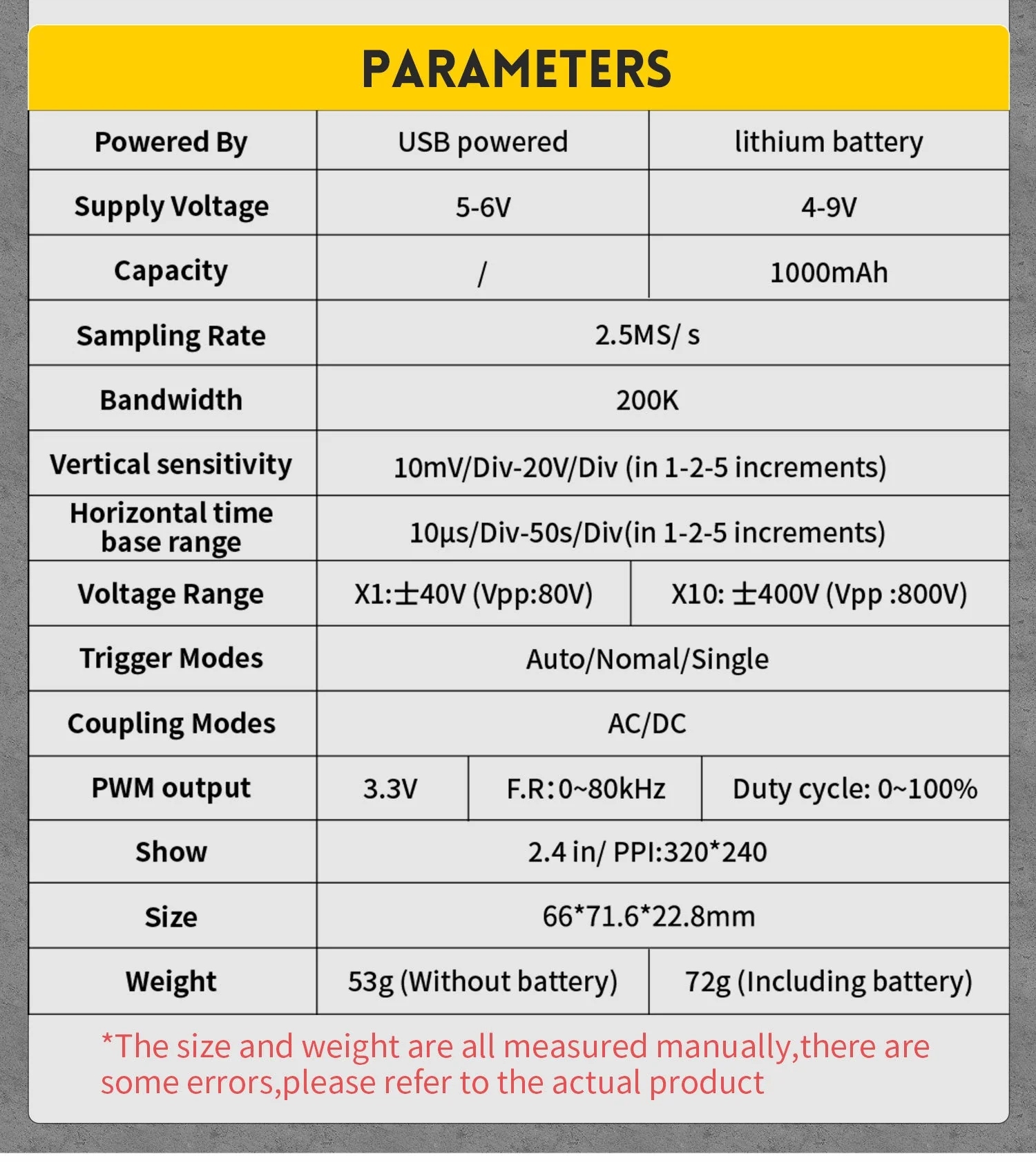 - Вихід прямокутного ШІМ-сигналу: цей осцилограф має функцію прямокутного вихідного сигналу ШІМ із частотним діапазоном 0–80 кГц і робочим циклом 0–100%.